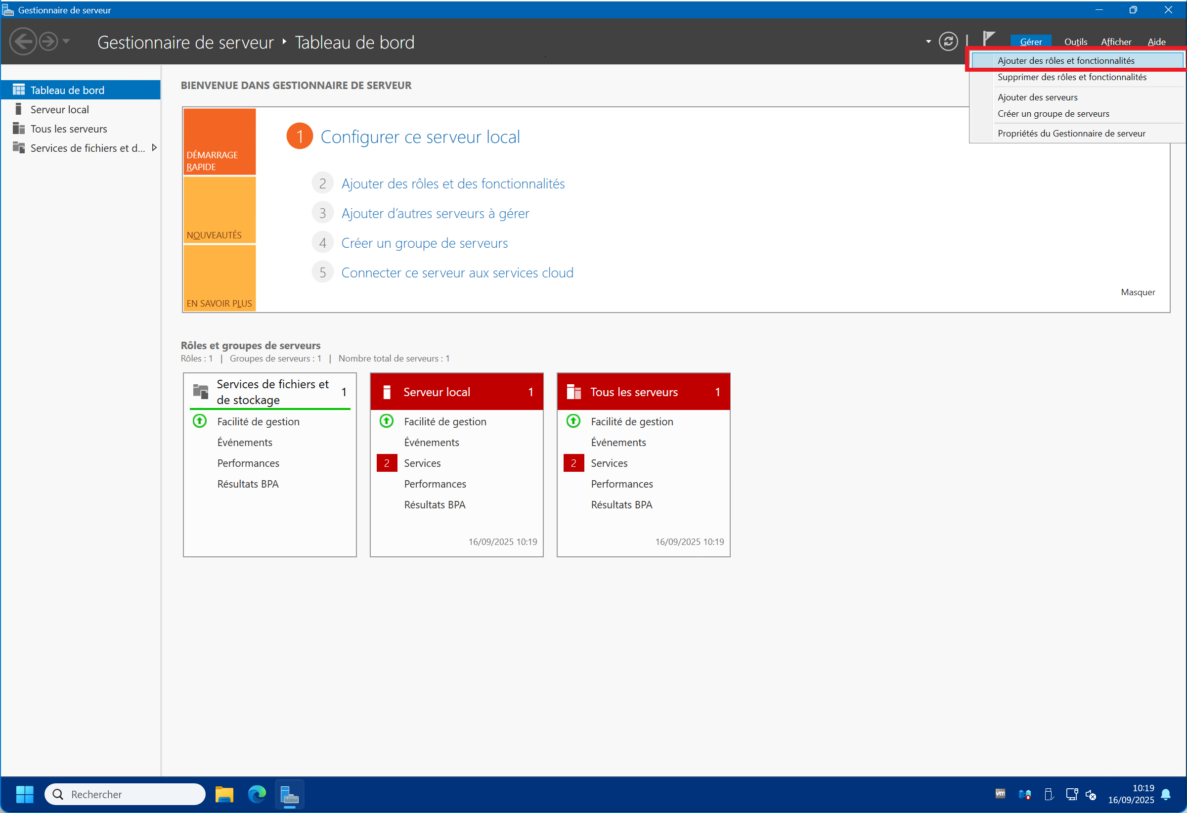 1 – Si ce n’est déjà fait, lancez le « Gestionnaire de Serveur » , puis cliquez sur « Gérer » en haut à droite, ensuite sur « Ajouter des rôles et fonctionnalités » :