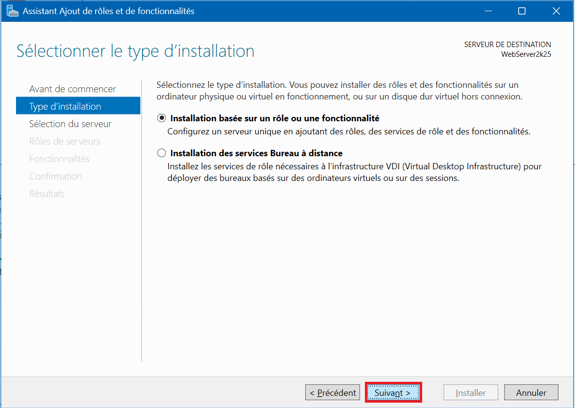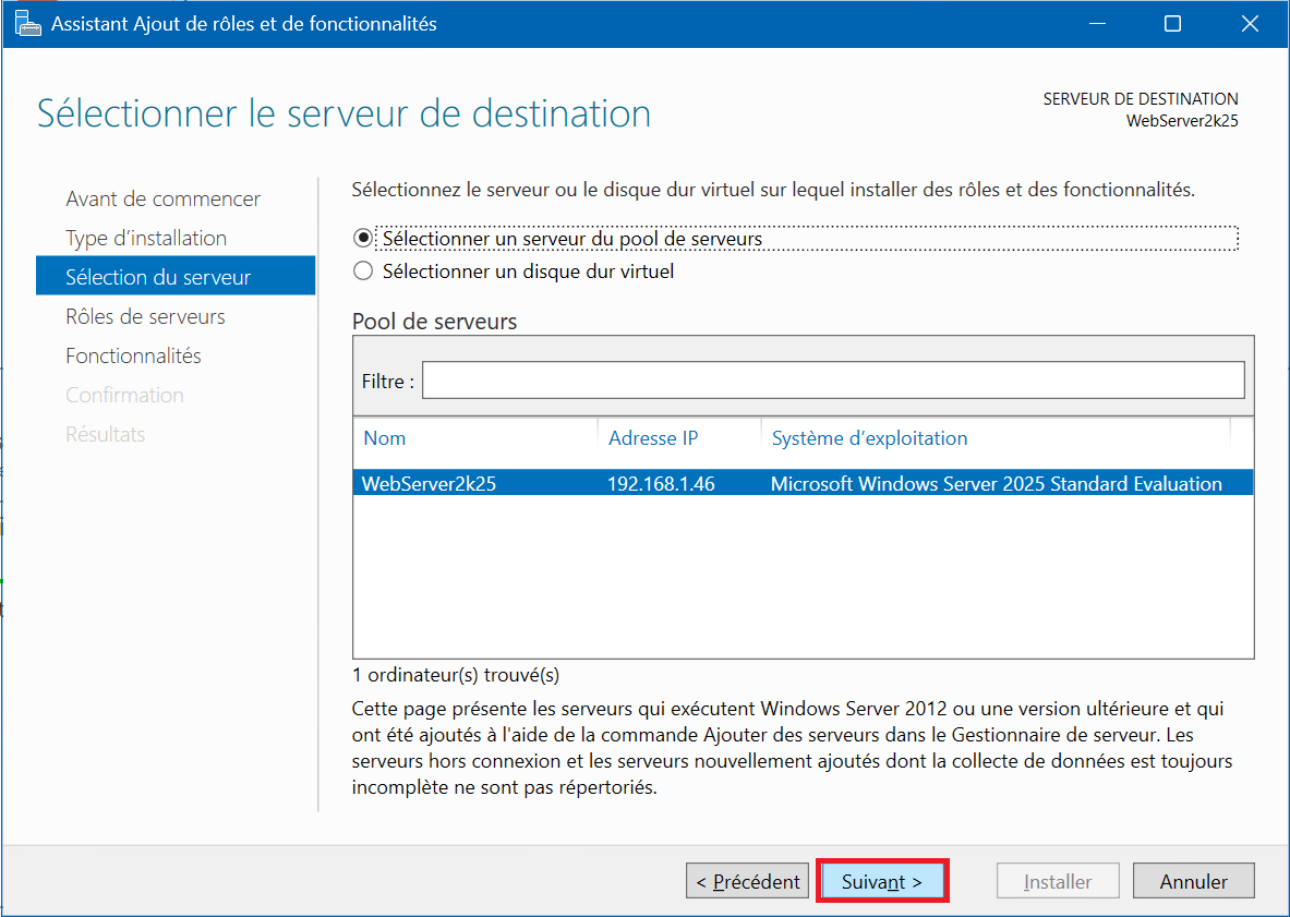 2 – Cliquez sur « Suivant » , puis sélectionnez « Installation basée sur un rôle ou une fonctionnalité » puis cliquez sur « Suivant » et enfin sélectionnez « Sélectionner un serveur du pool de serveurs » , puis cliquez sur « Suivant » :
