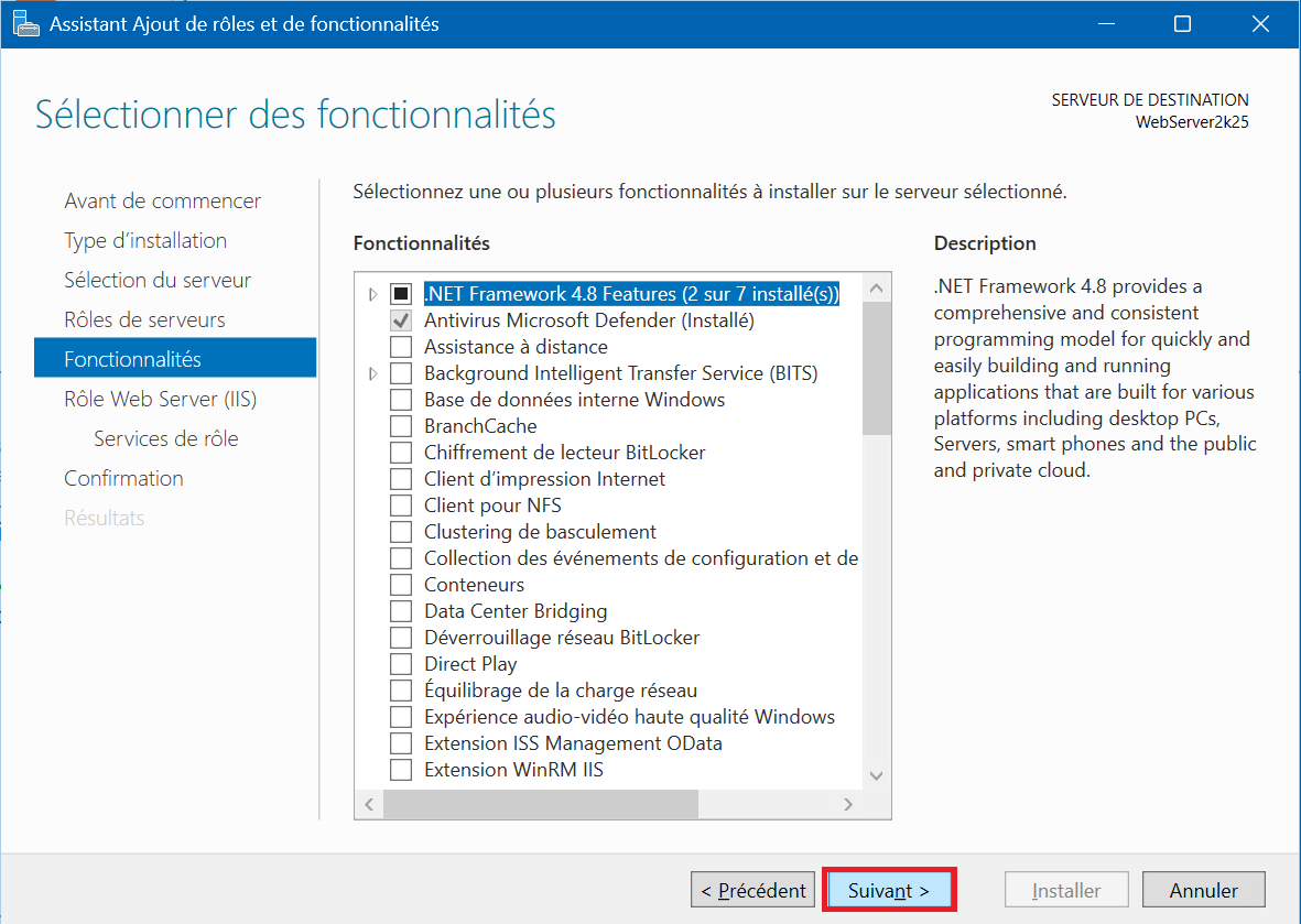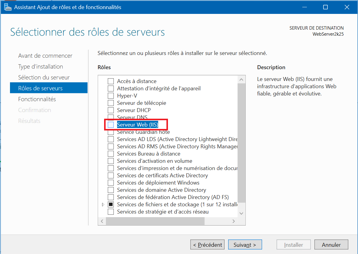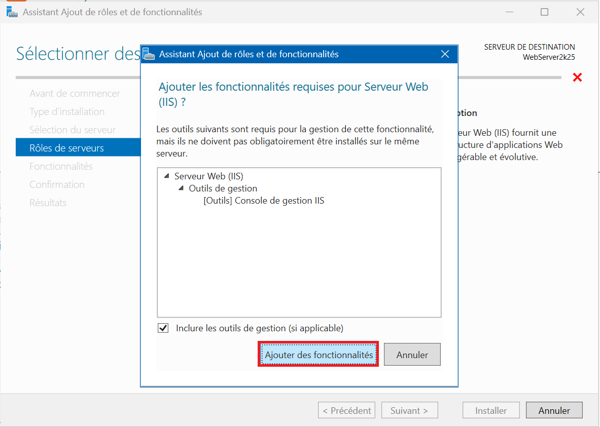 3 – Dans le menu « Rôles » cochez la case « Serveur Web (IIS) » , puis dans le pop-up qui apparaît cliquez sur « Ajouter des fonctionnalités » , et enfin dans la partie « Fonctionnalités » cliquez sur « Suivant » :
