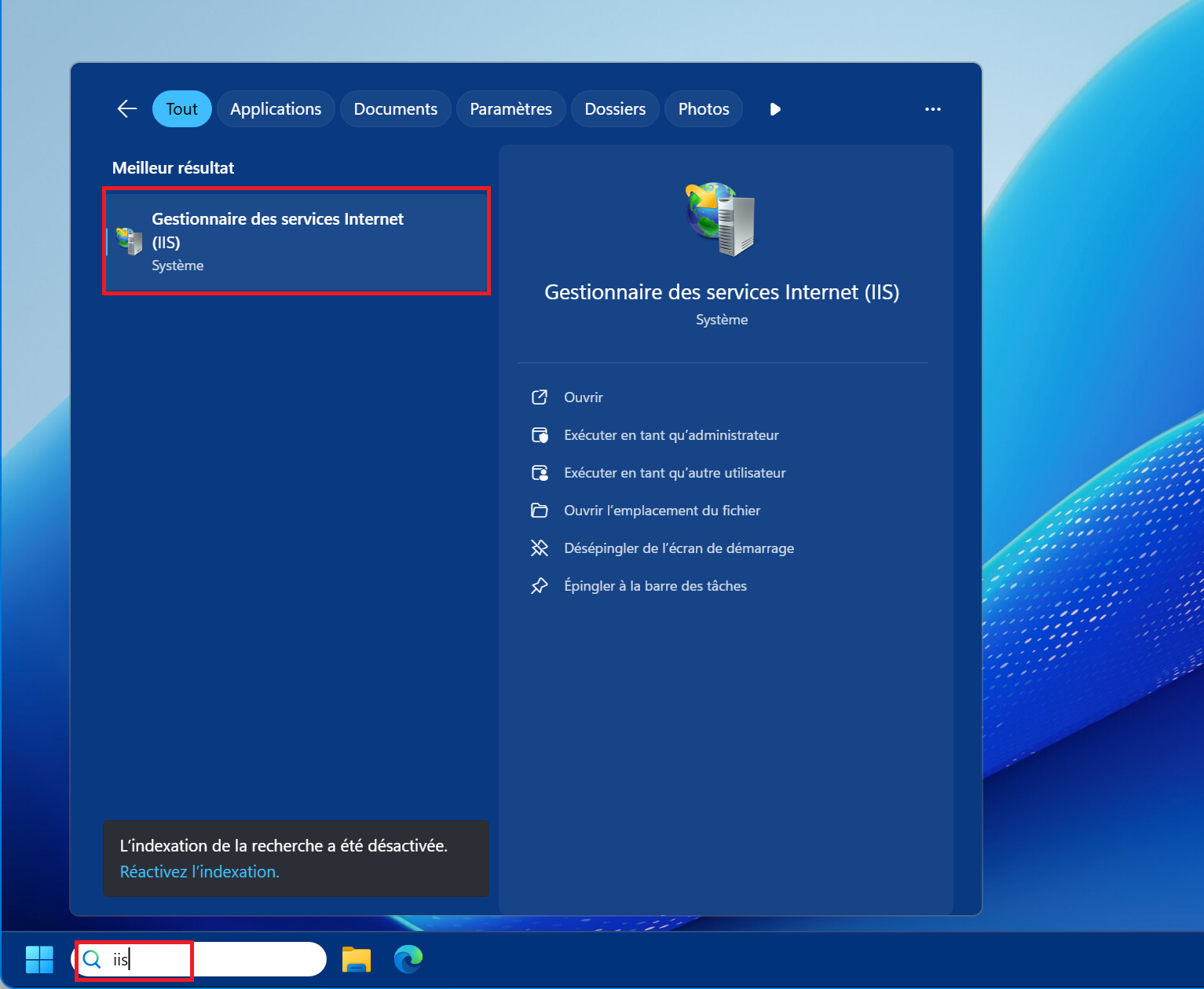 7 – Vous pouvez maintenant lancer le « Gestionnaire des services Internet (IIS) » à partir du menu Démarrer ou de la barre de recherche :