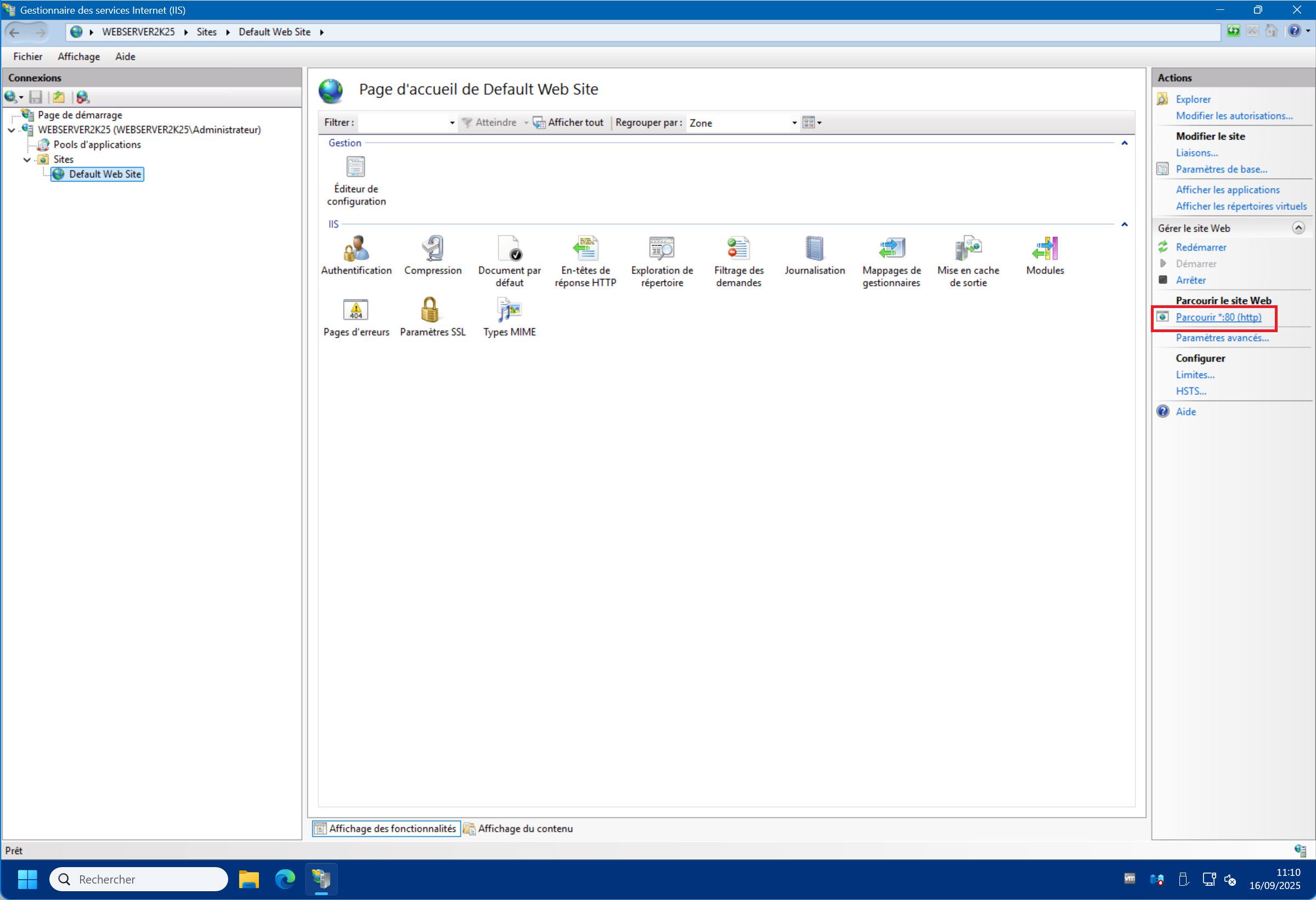 8 – Dans le « Gestionnaire des services Internet (IIS) » vous pouvez déjà voir un premier site Web par défaut en déroulant l’arborescence en dessous du serveur et de « Sites » . Cliquez sur « Default Web Site » , puis sur « Parcourir *:80 (http) » afin de visualiser le site :