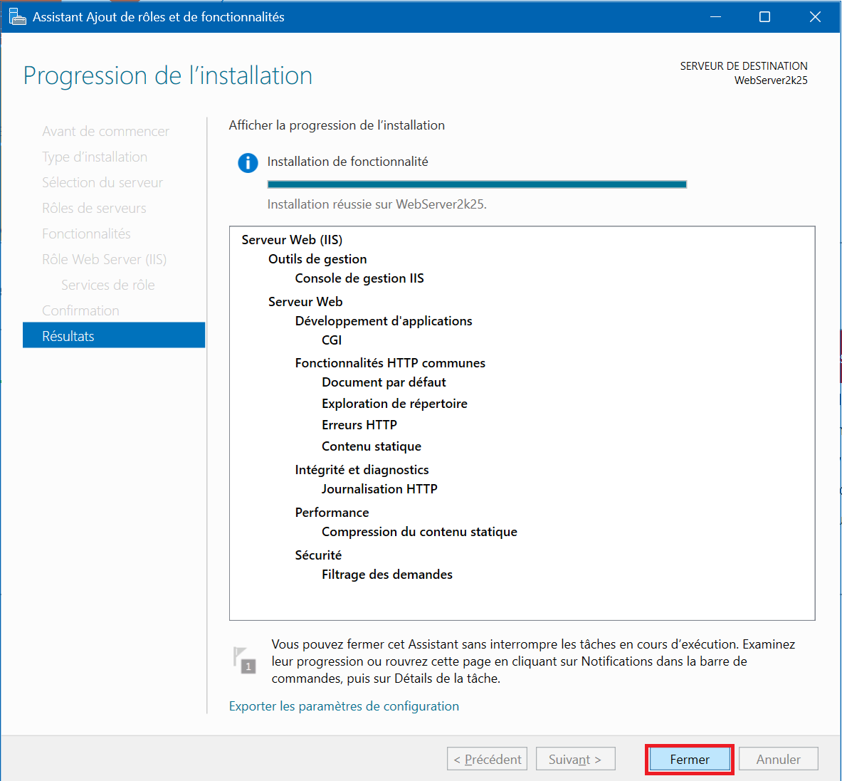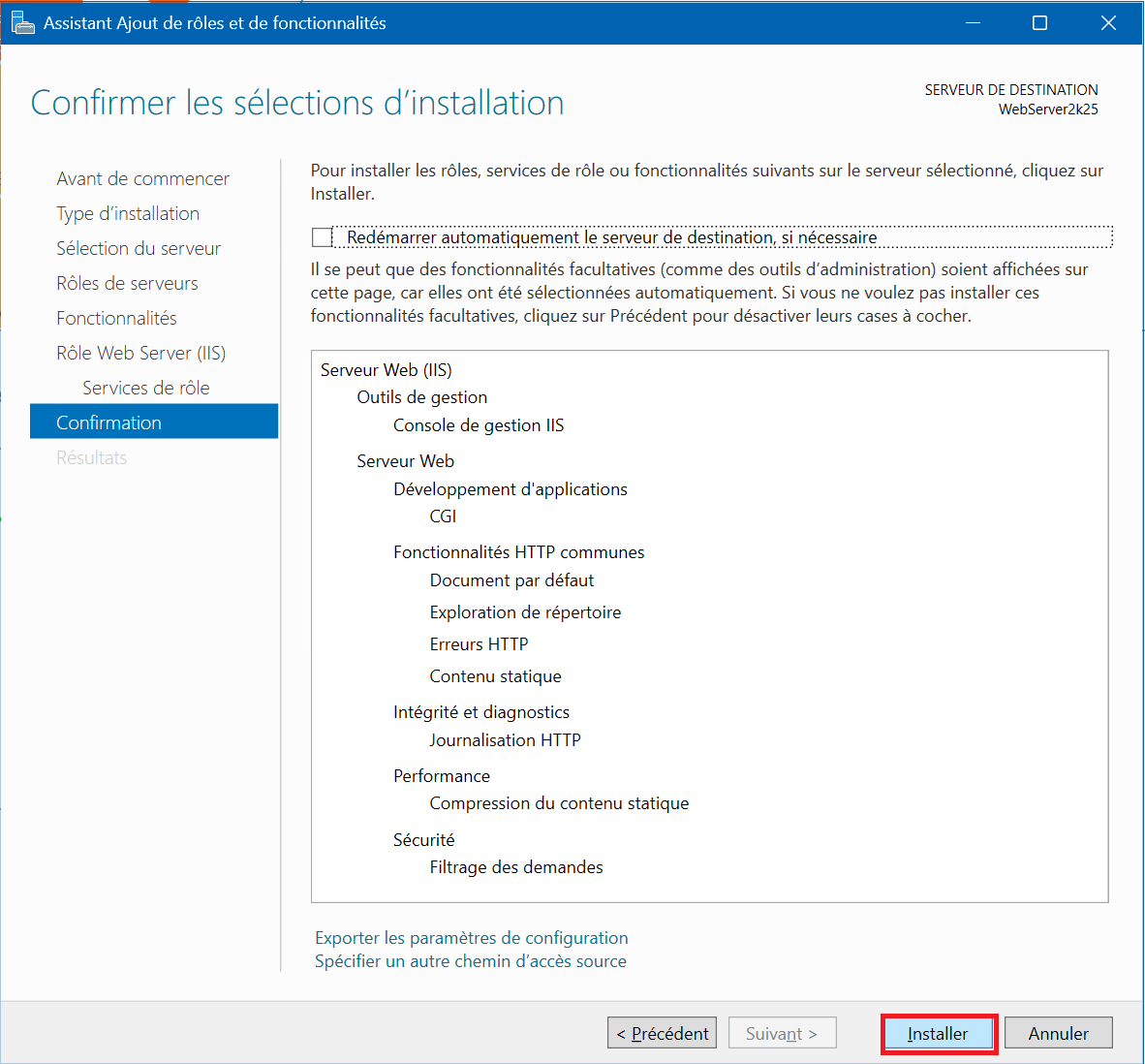 6 – Dans la partie « Confirmation » cliquez sur « Installer » puis sur « Fermer » une fois l’installation terminée :