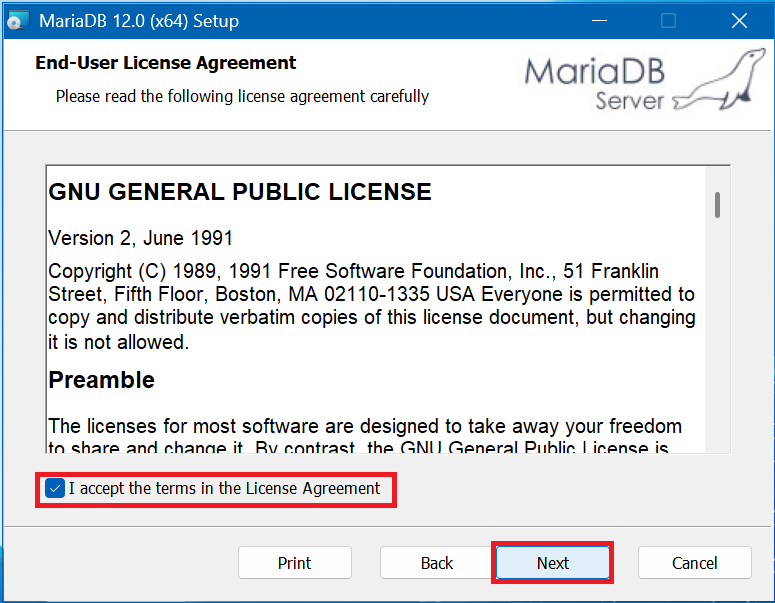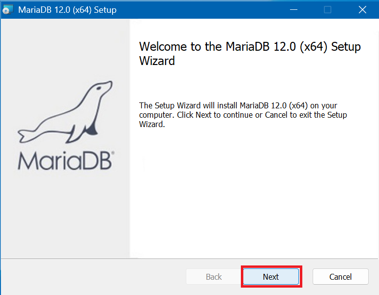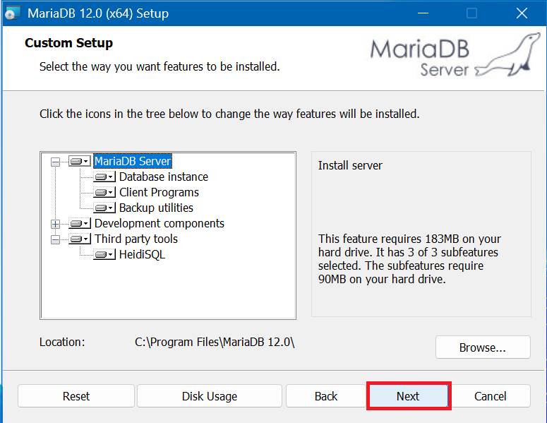 1 – Lancez le package d’installation de MariaDB (mariadb-12.0.2-winx64.msi) puis cliquez sur « Next » . Ensuite cochez la case « I accept the terms in the License Agreement » , puis cliquez sur « Next » . Laissez les choix par défaut (par défaut installez tout, notamment « HeidiSQL » qui sera utile plus tard) et cliquez sur « Next » :