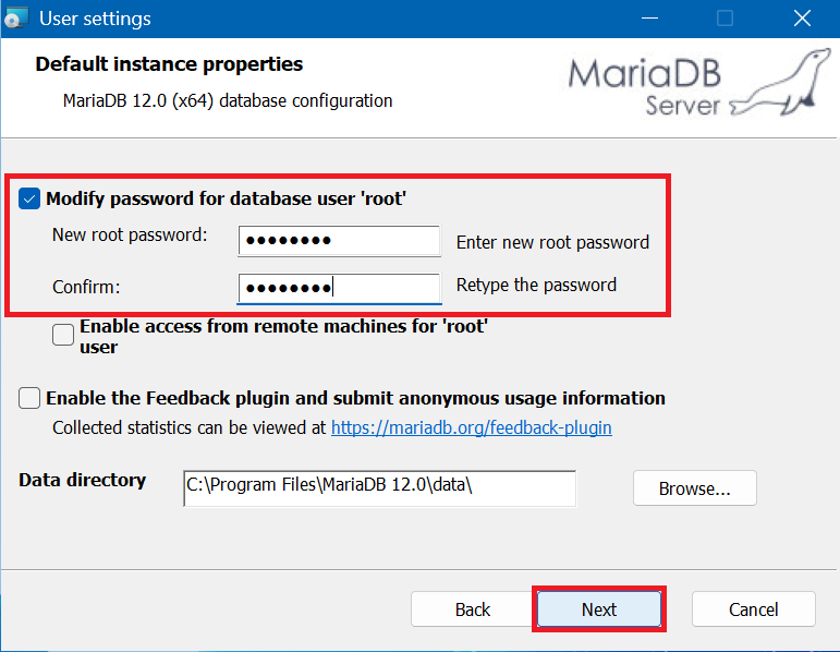 2 – Cochez « Modify password for database user ‘root’ » , puis entrez et confirmez un mot de passe de votre choix (notez bien ce mot de passe pour plus tard) et enfin cliquez sur « Next » :
