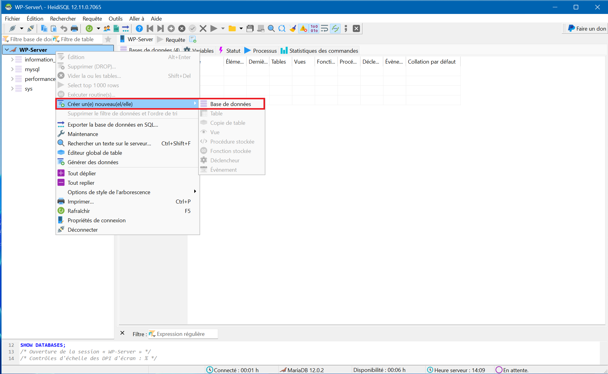 5 – Une fois la session ouverte faites un clic-droit sur le nom de la session, puis sélectionnez « Créer un(e) nouveau(el/elle) » et cliquez sur « Base de données » :