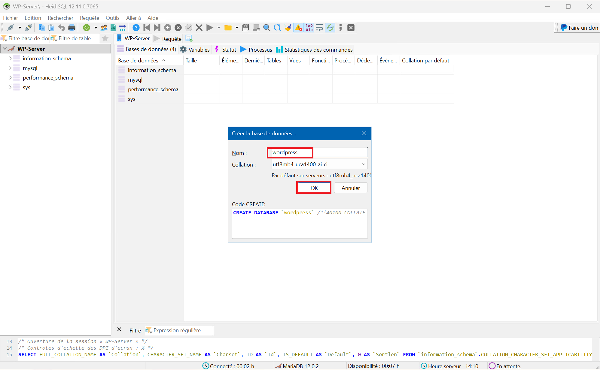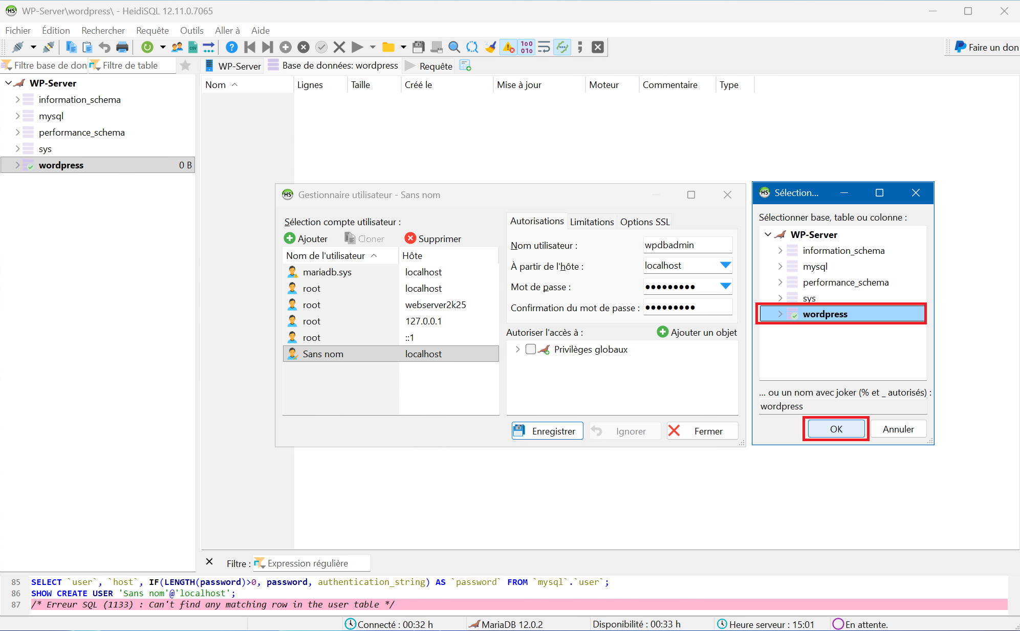 10 – Cliquez sur la base que vous avez créée (« wordpress » dans notre exemple) puis sur « OK » :