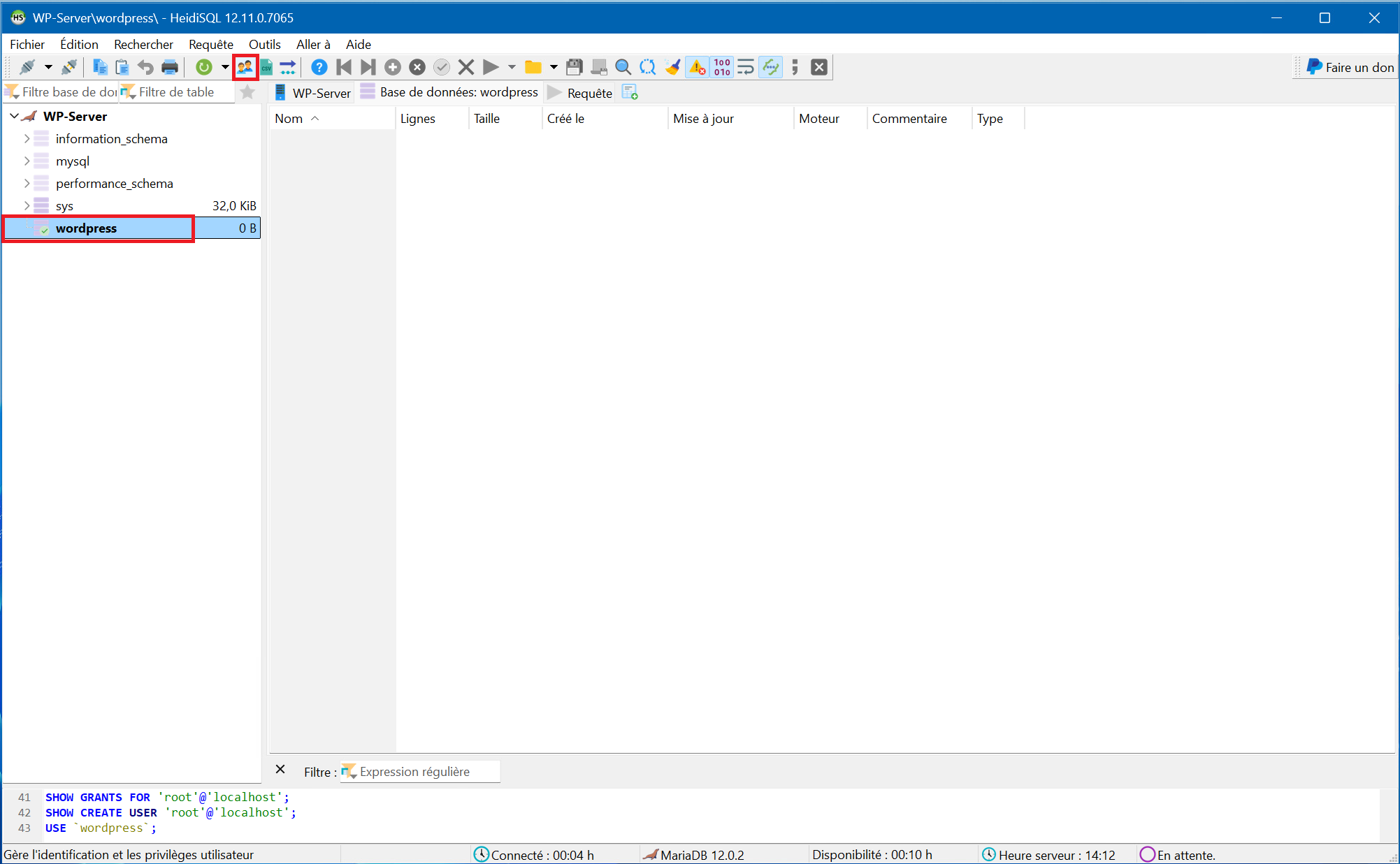 7 – Cliquez sur la base de donnée nouvellement créée puis sur le bouton « Gestionnaire utilisateur » (icone avec deux personnages) :