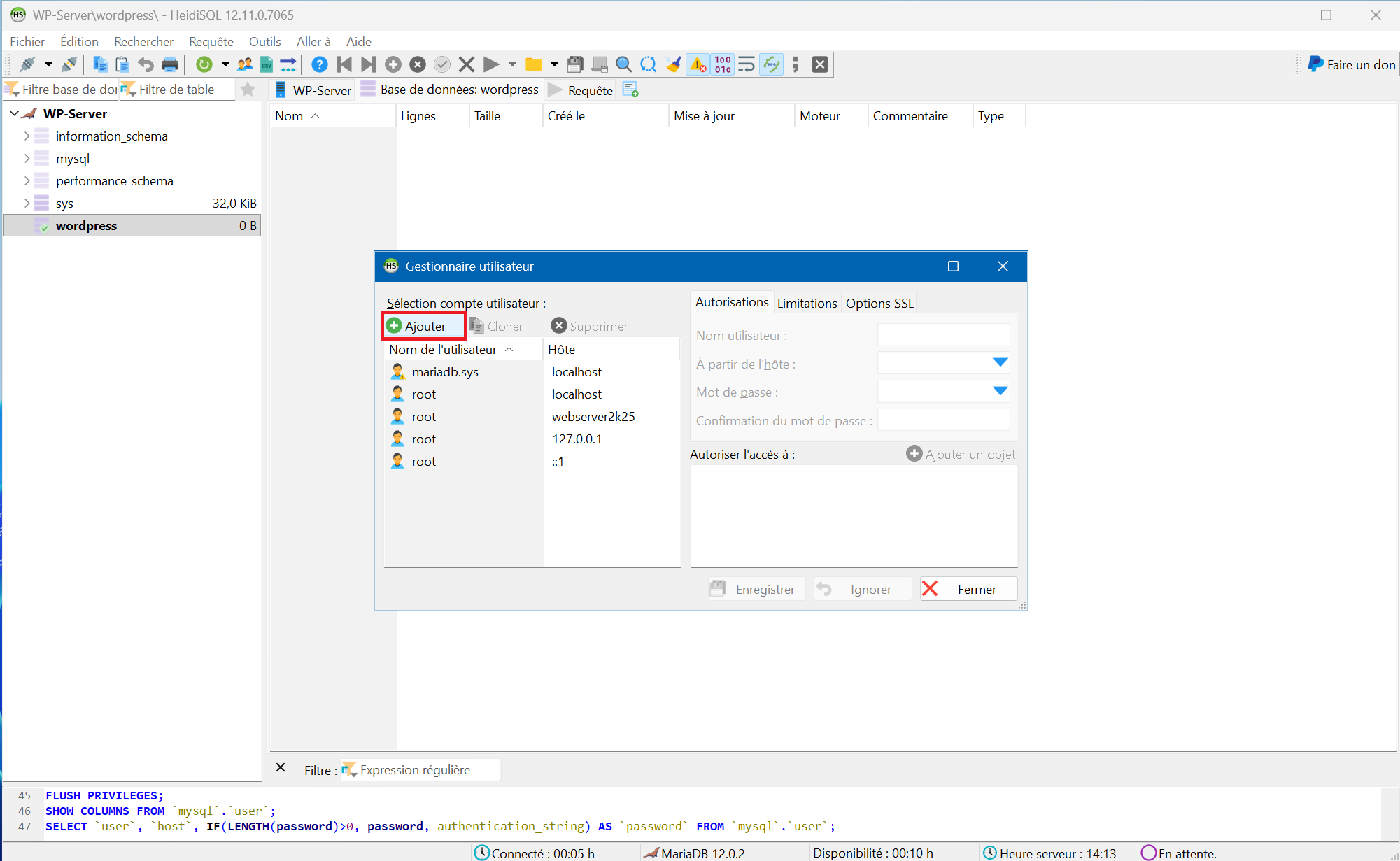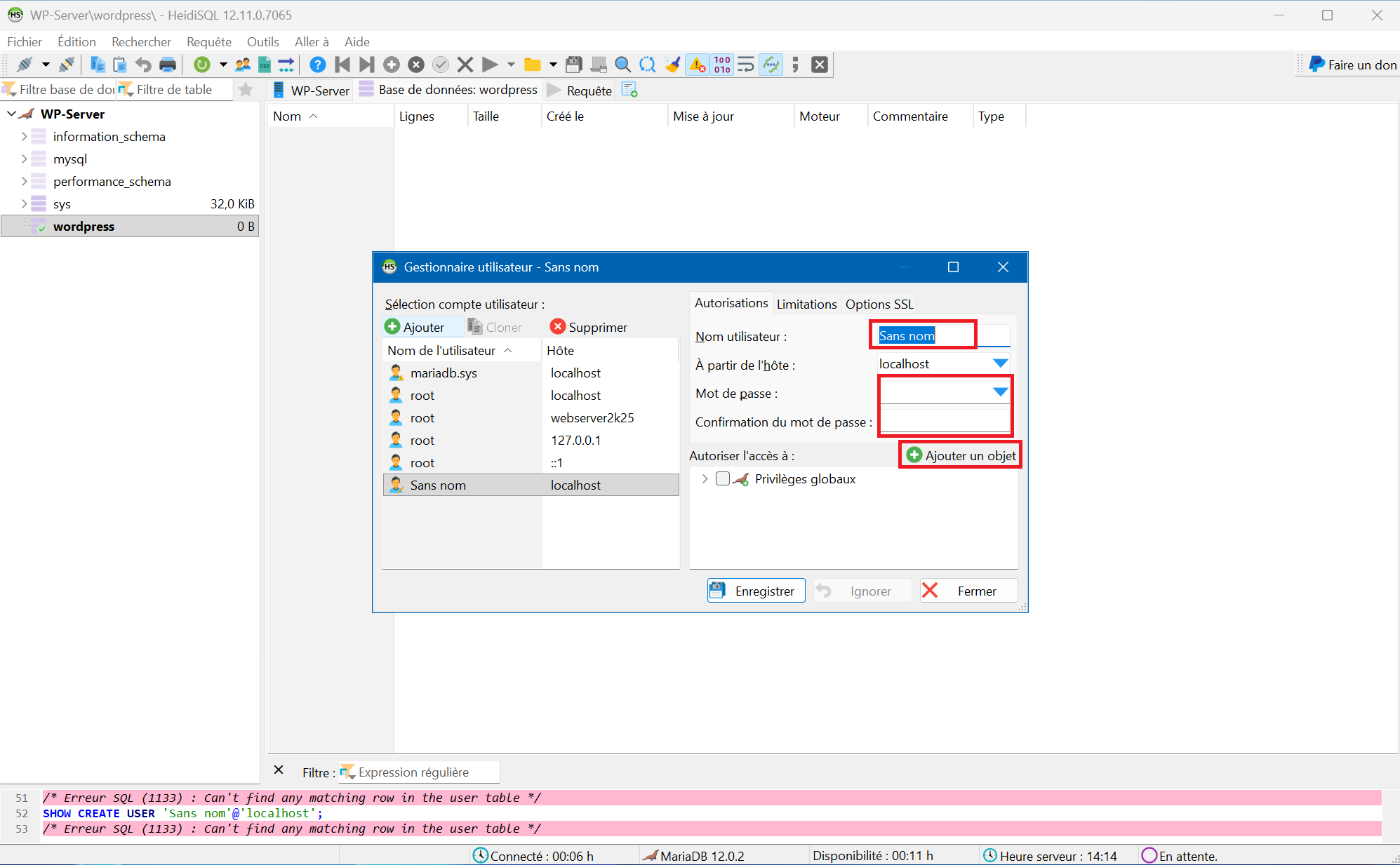 9 – D’abord entrez un nom d’utilisateur de votre choix dans le champ « Nom d’utilisateur » . Puis dans champ « À partir de l’hôte: » laissez « localhost » par défaut. Ensuite dans les champ suivants entrez un mot de passe de votre choix et confirmez le. Et enfin cliquez sur le bouton « Ajouter un objet » .