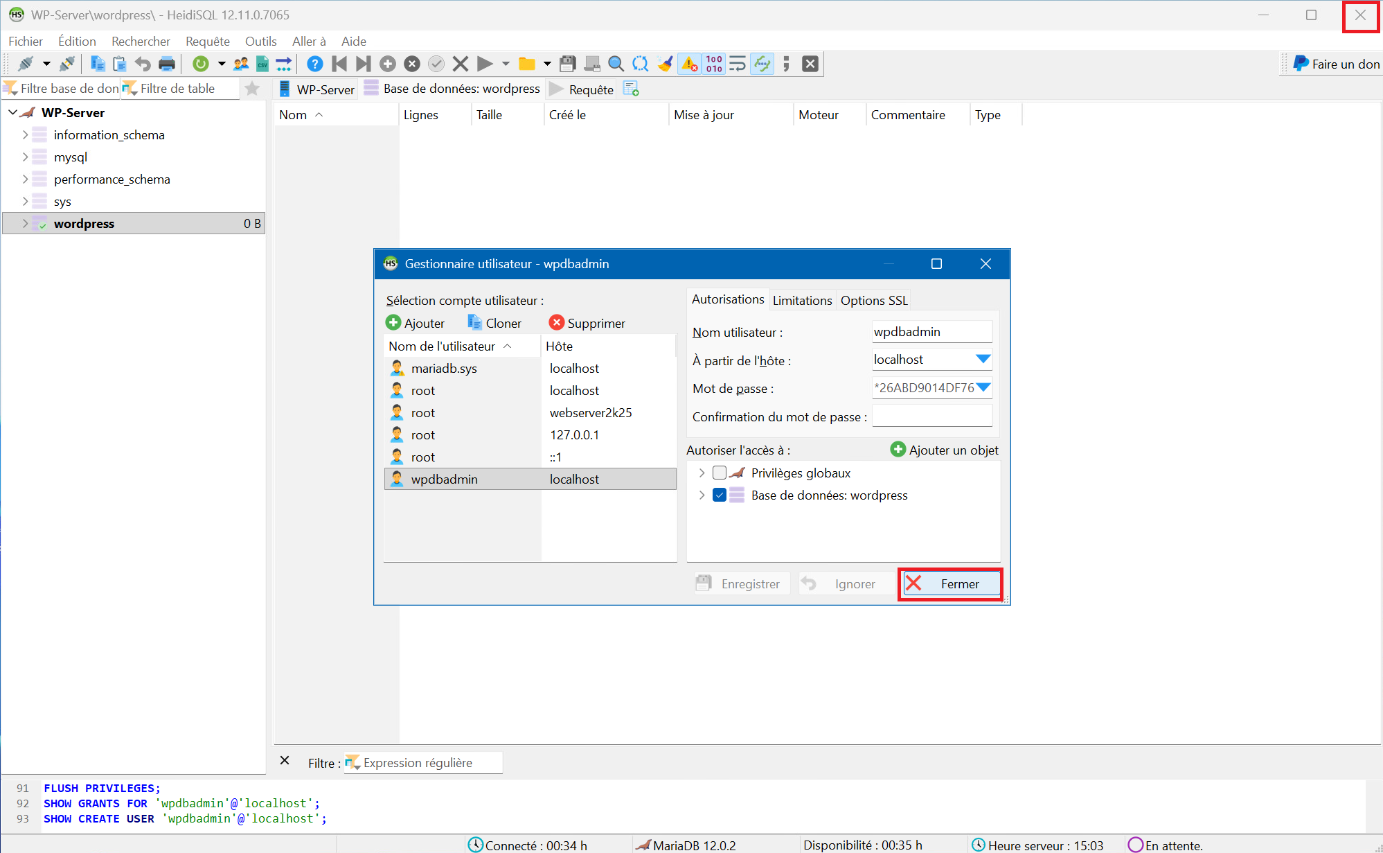 12 – Vous pouvez cliquer sur « Fermer » et fermer également HeidiSQL. Votre base de données est prête!