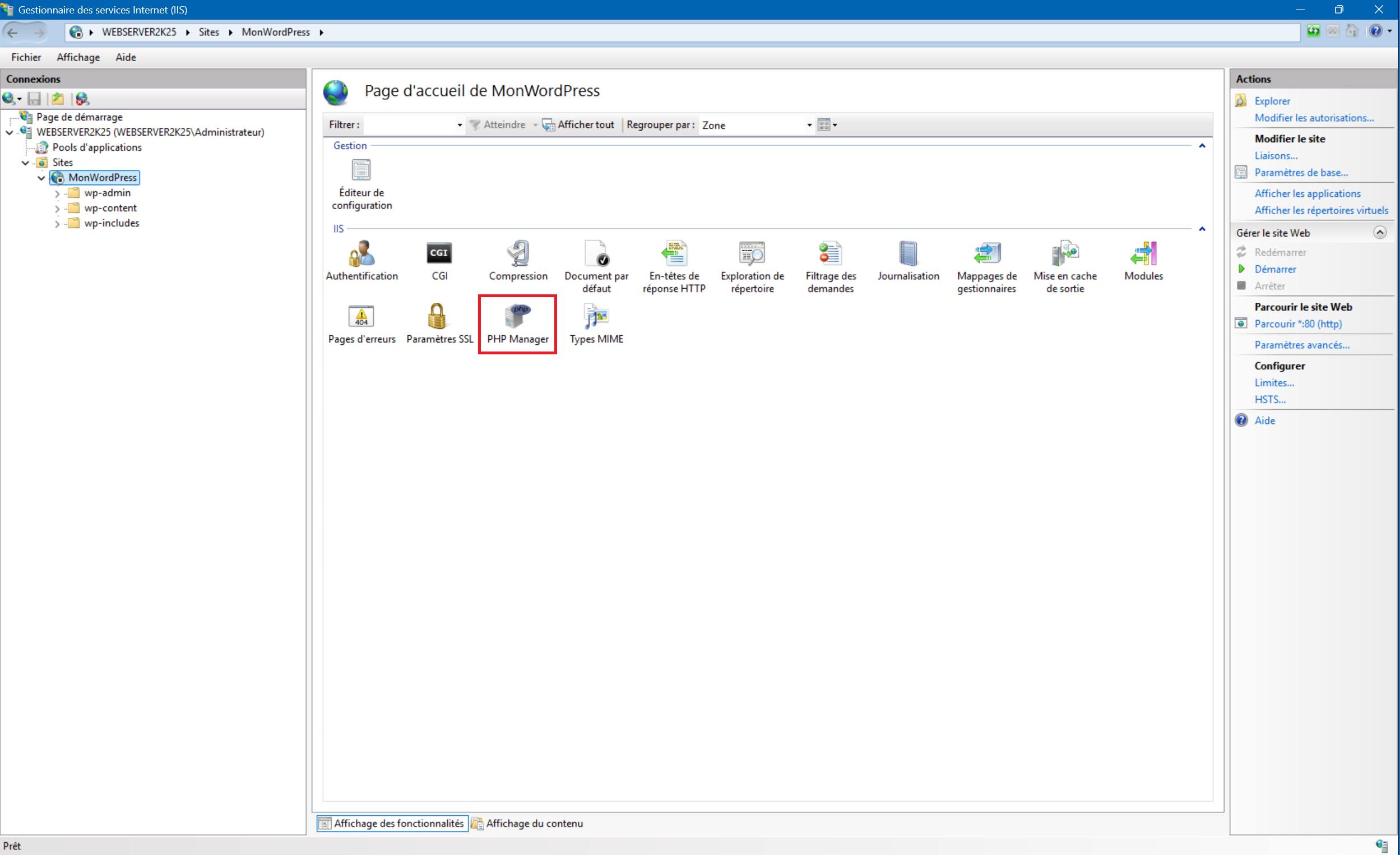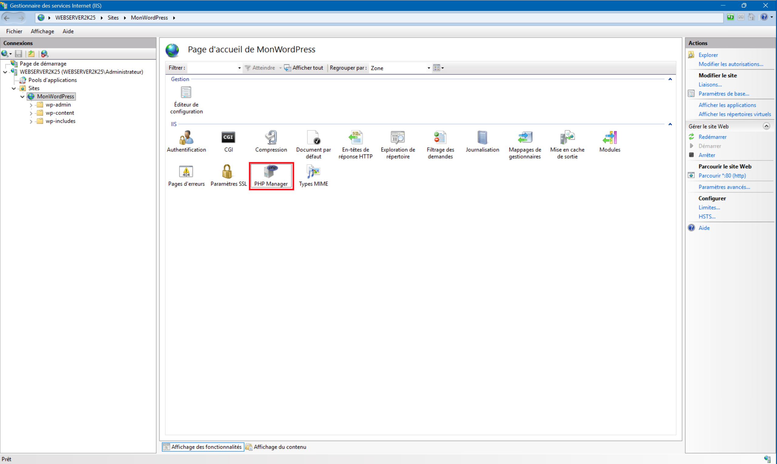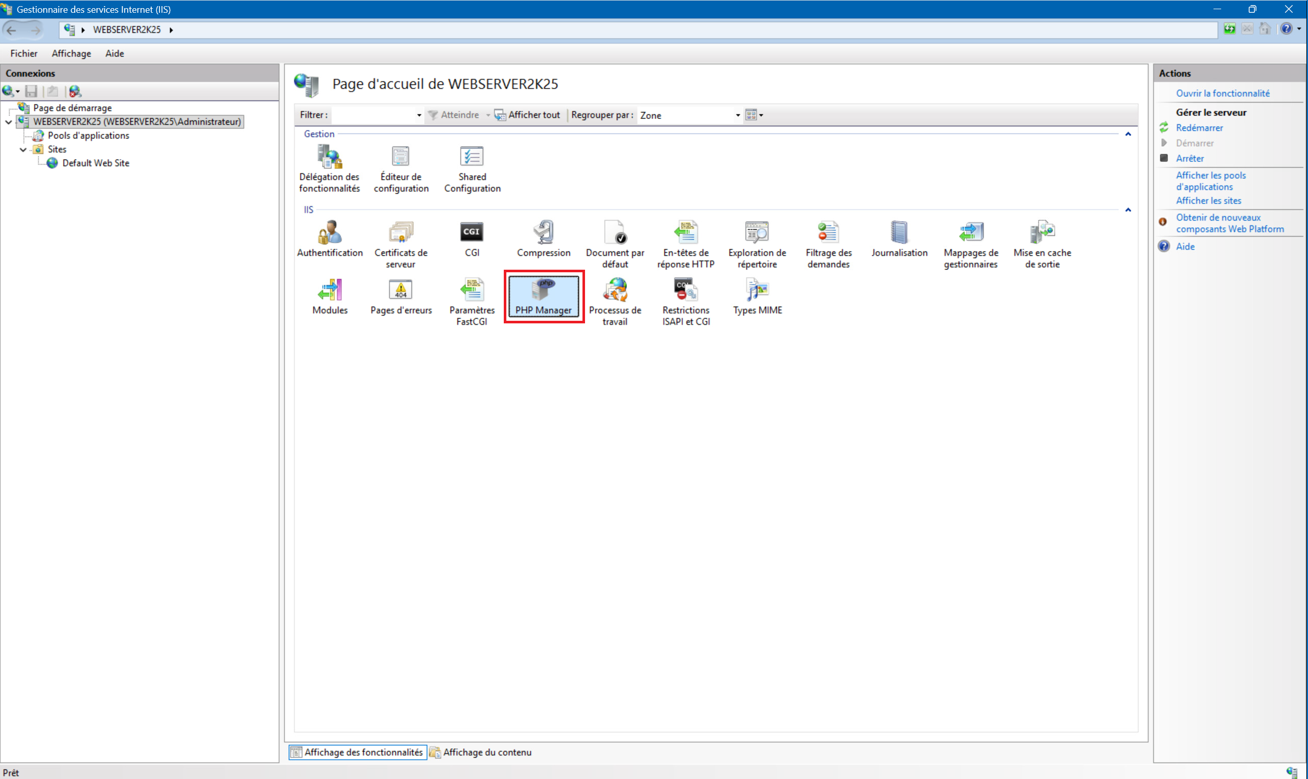 4 – Dans la console de gestion IIS vous devriez avoir l’icone « PHP Manager » désormais. PHP est installé sur votre serveur!
