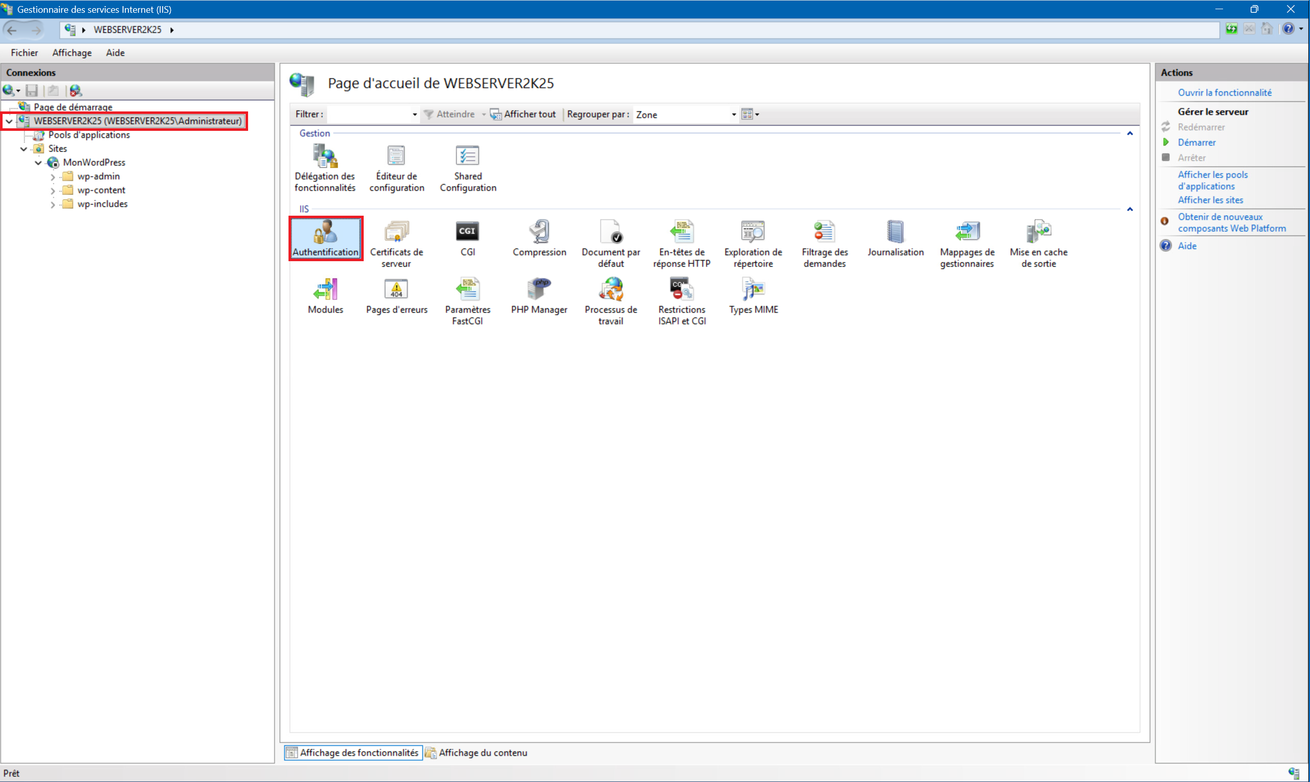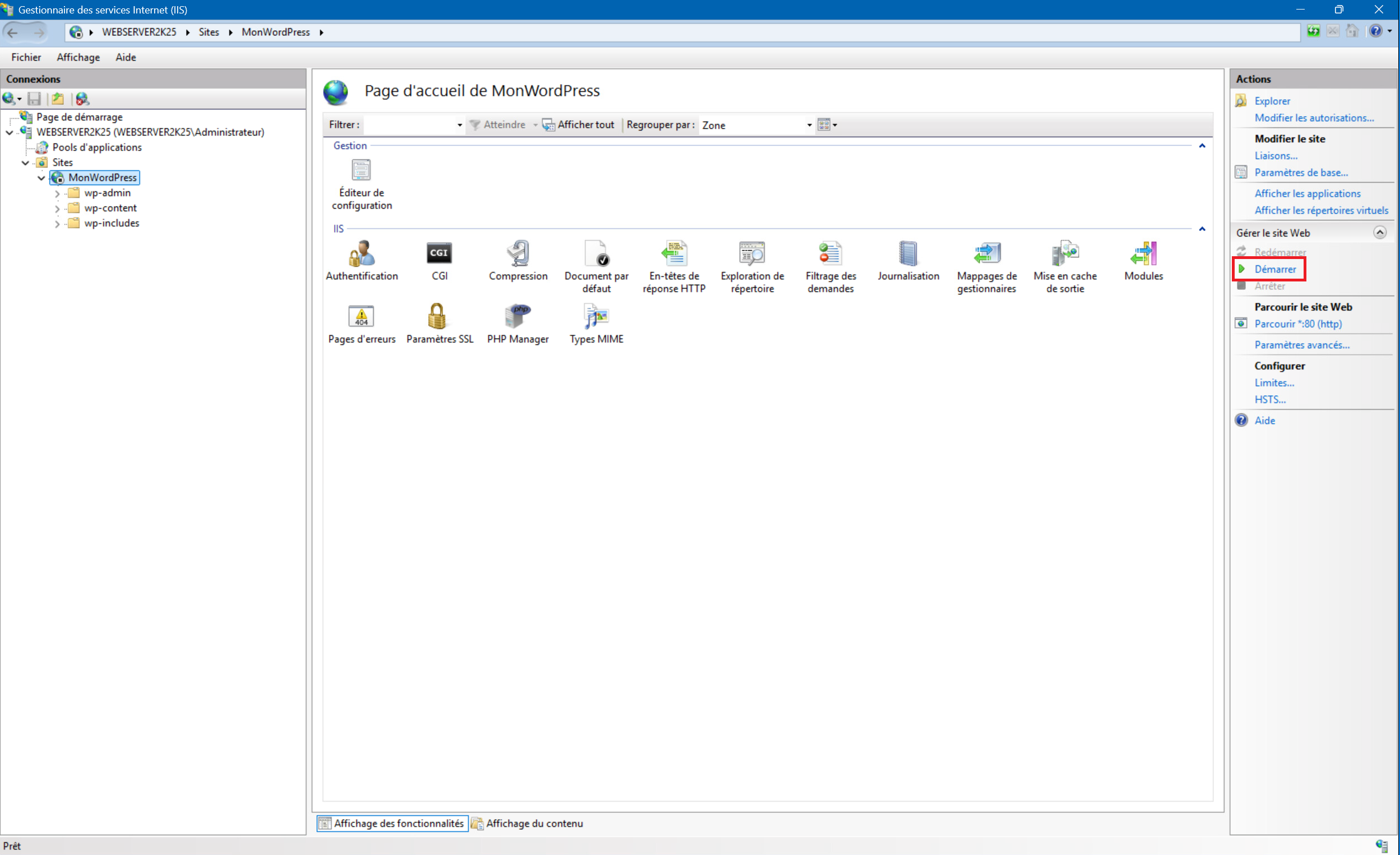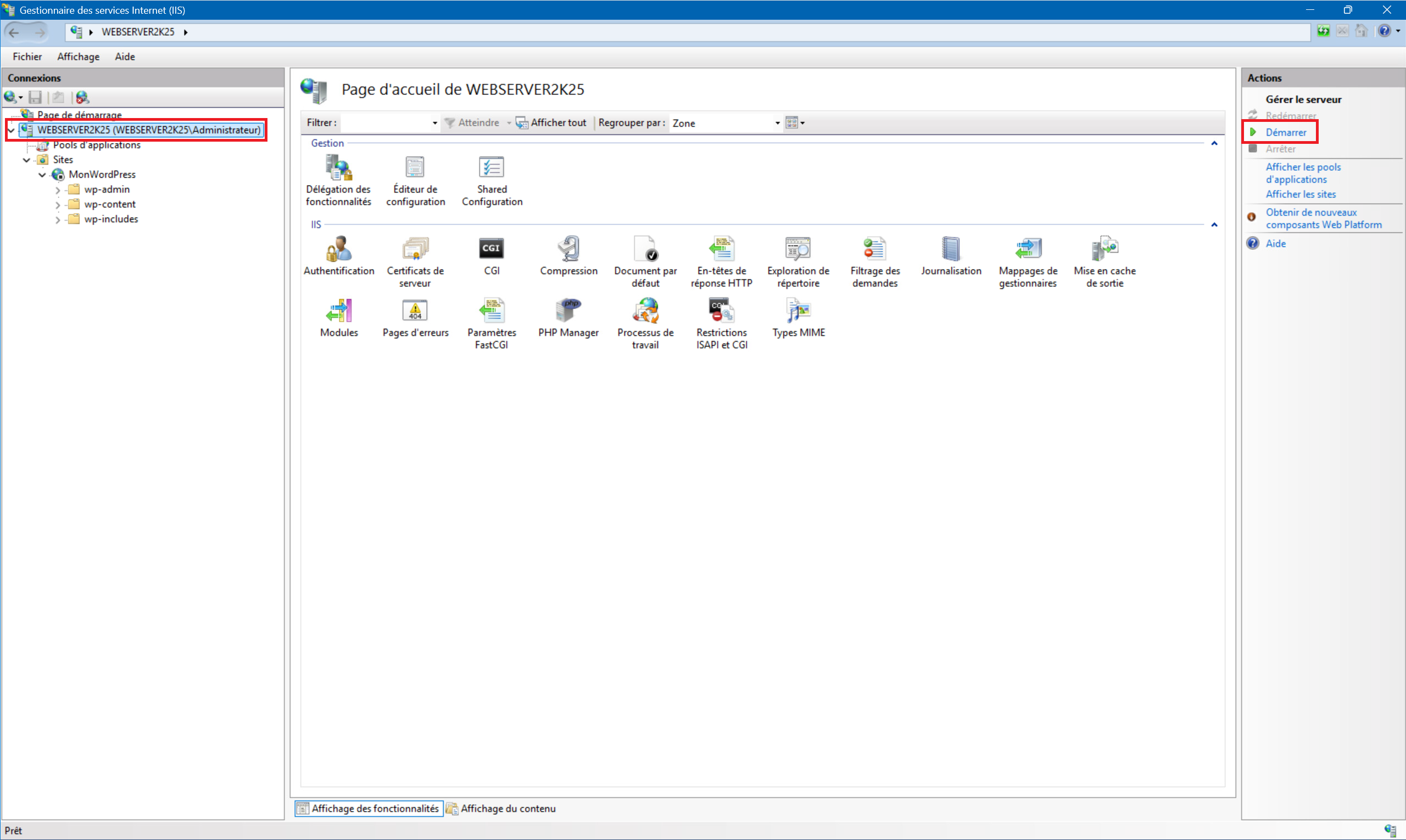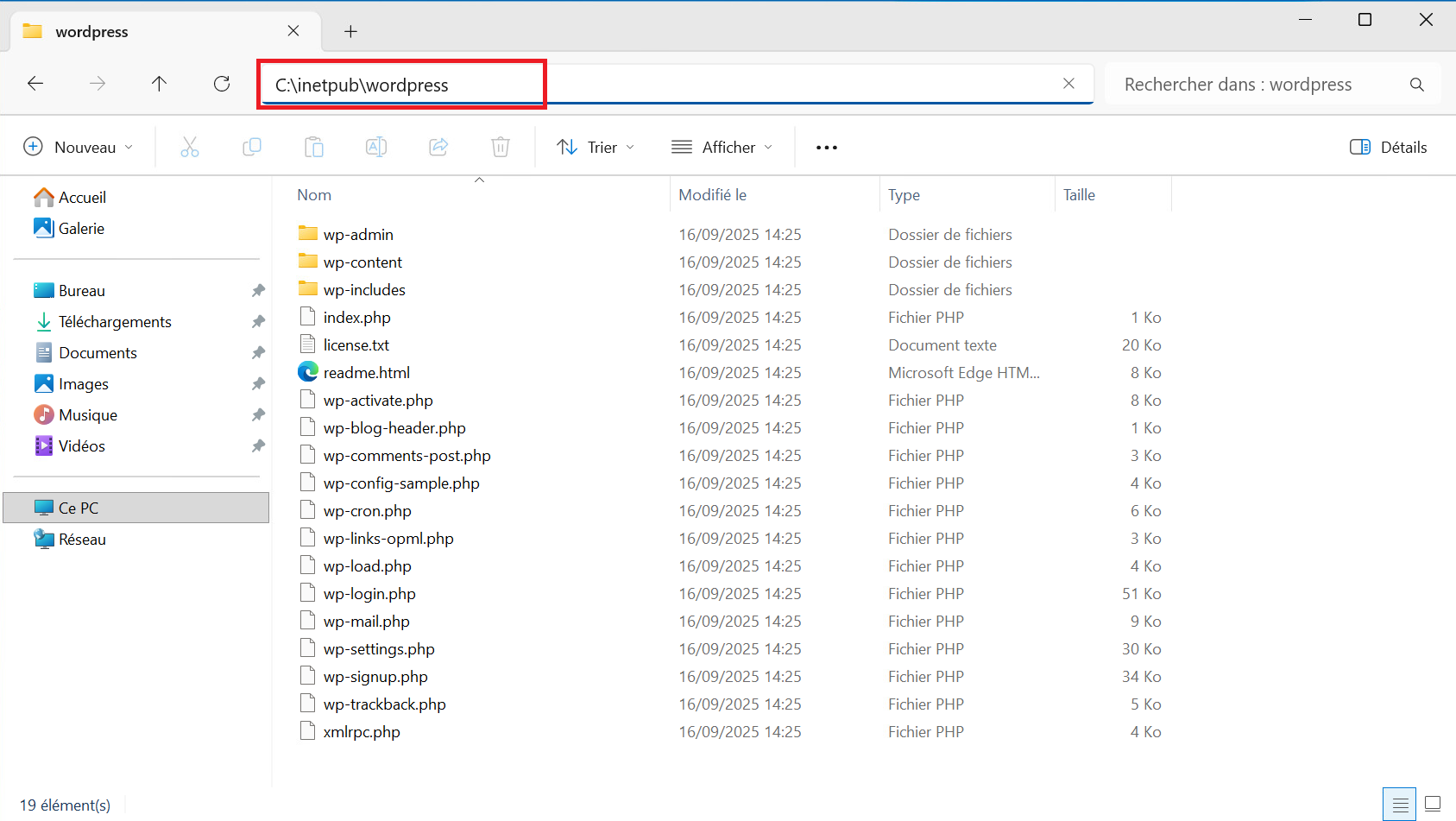 1 – Décompressez l’archive « wordpress-6.8.2-fr_FR.zip » . Les fichiers décompressés doivent se trouver dans « C:\inetpub\wordpress » :