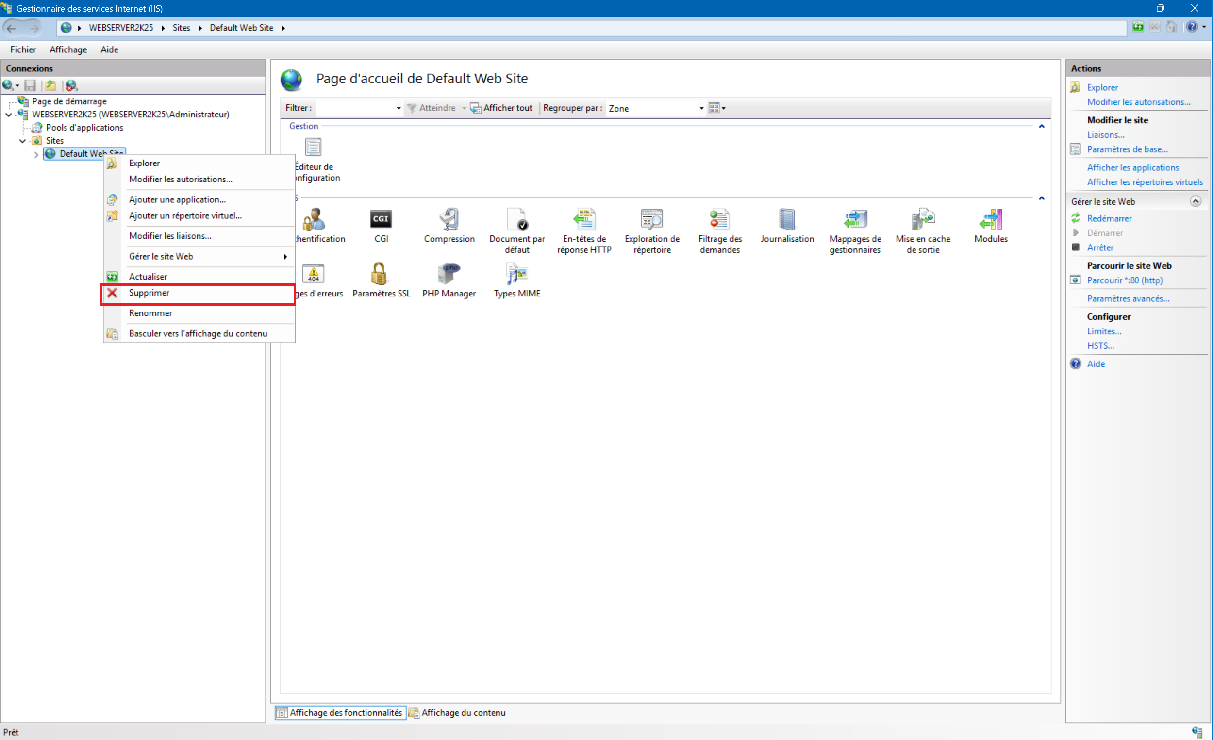 1 – Retournez dans le Gestionnaire des services Internet, déroulez le menu Connexions à gauche, NOMDUSERVEUR > Sites, puis faites un clic droit sur le site « Default Web Site » et cliquez sur « Supprimer » :