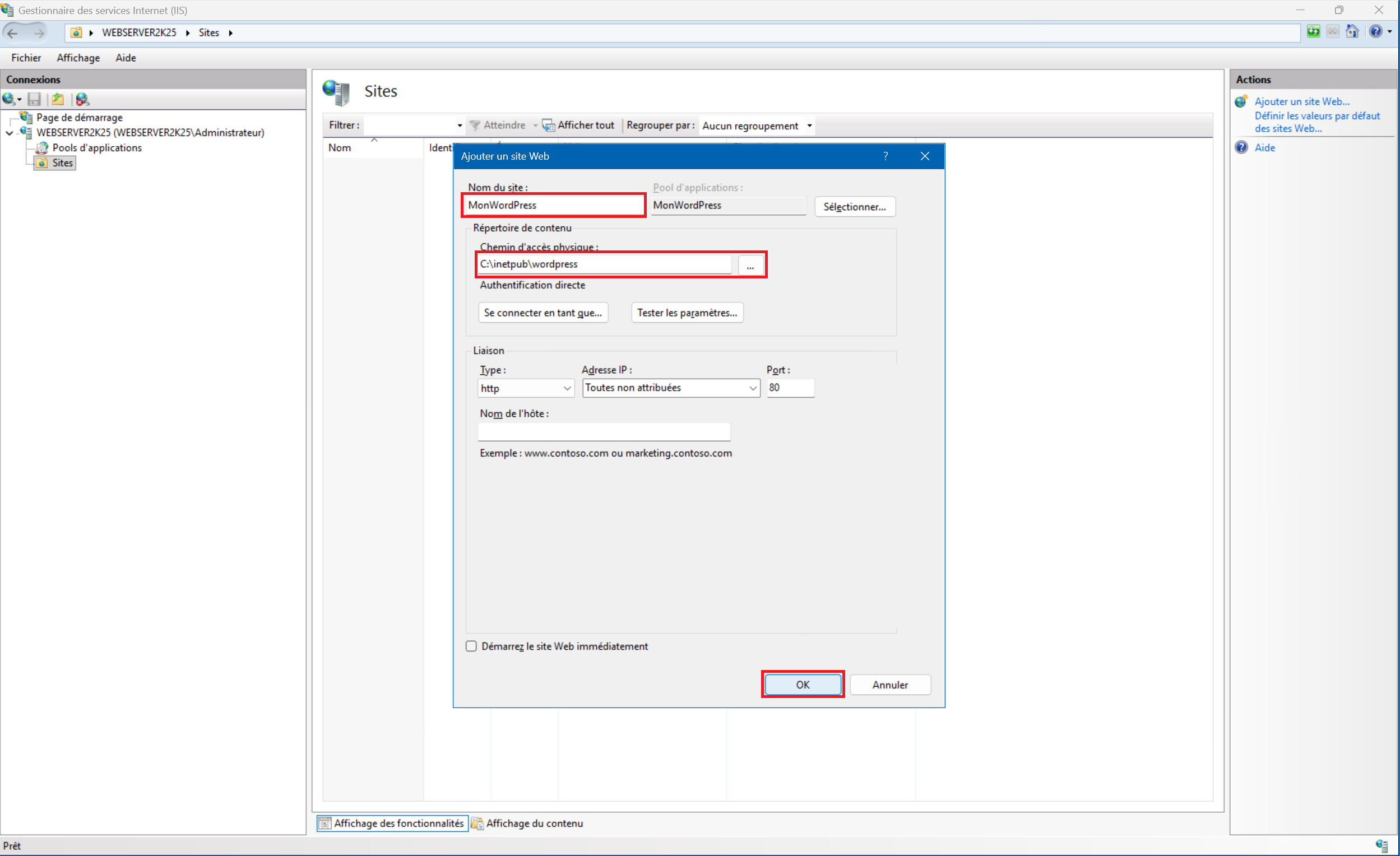 3 – Donnez un nom à votre site dans le champ « Nom du site : » , puis dans le champ « Chemin d’accès physique : » définissez le répertoire où l’archive de WordPress a été décompressée précédemment. Ici dans notre exemple « C:\inetpub\wordpress » (vous pouvez parcourir les fichiers en cliquant sur le bouton « … » ou saisir directement le chemin d’accès dans le champs). Et enfin cliquez sur « OK » pour valider la création du site :