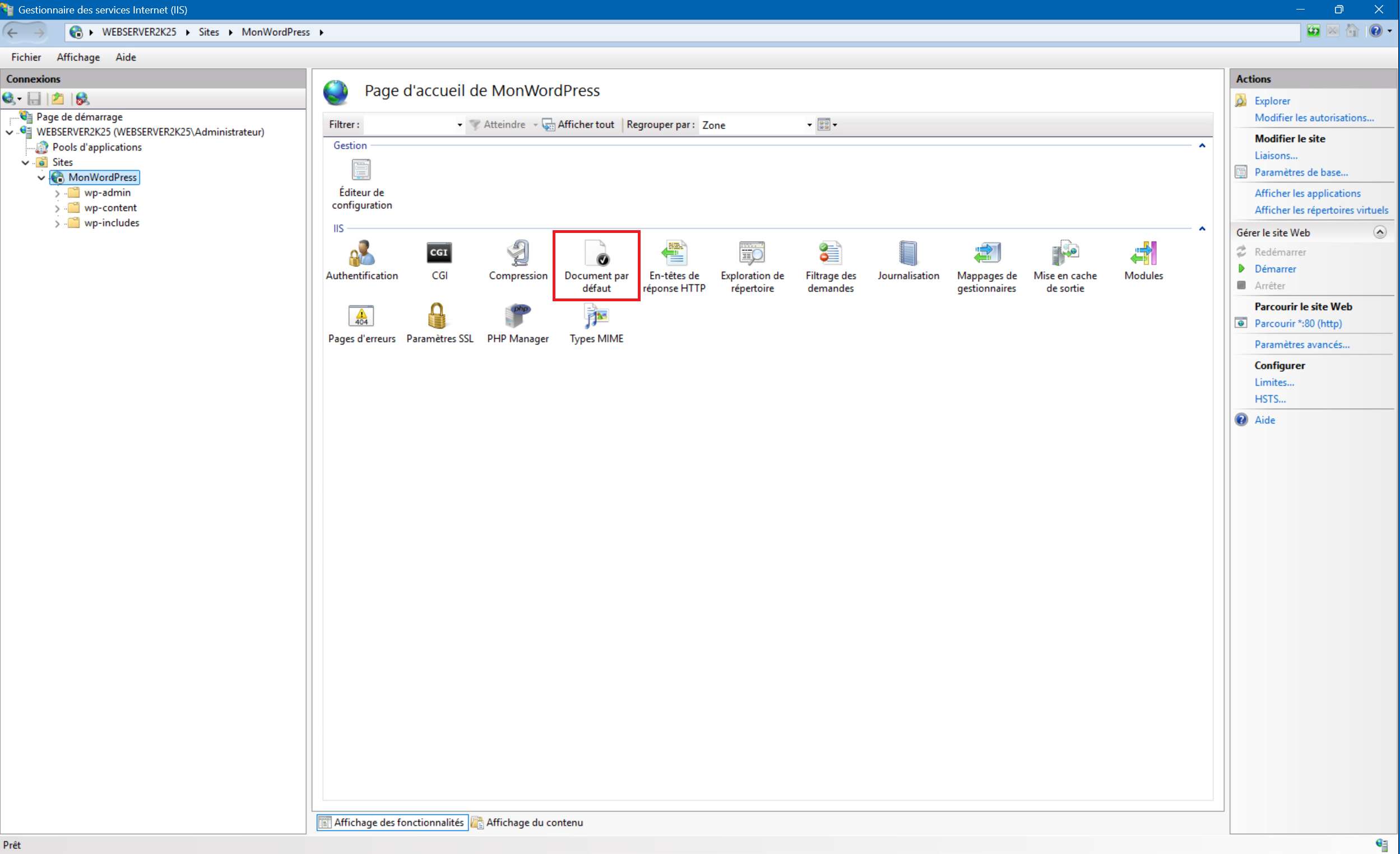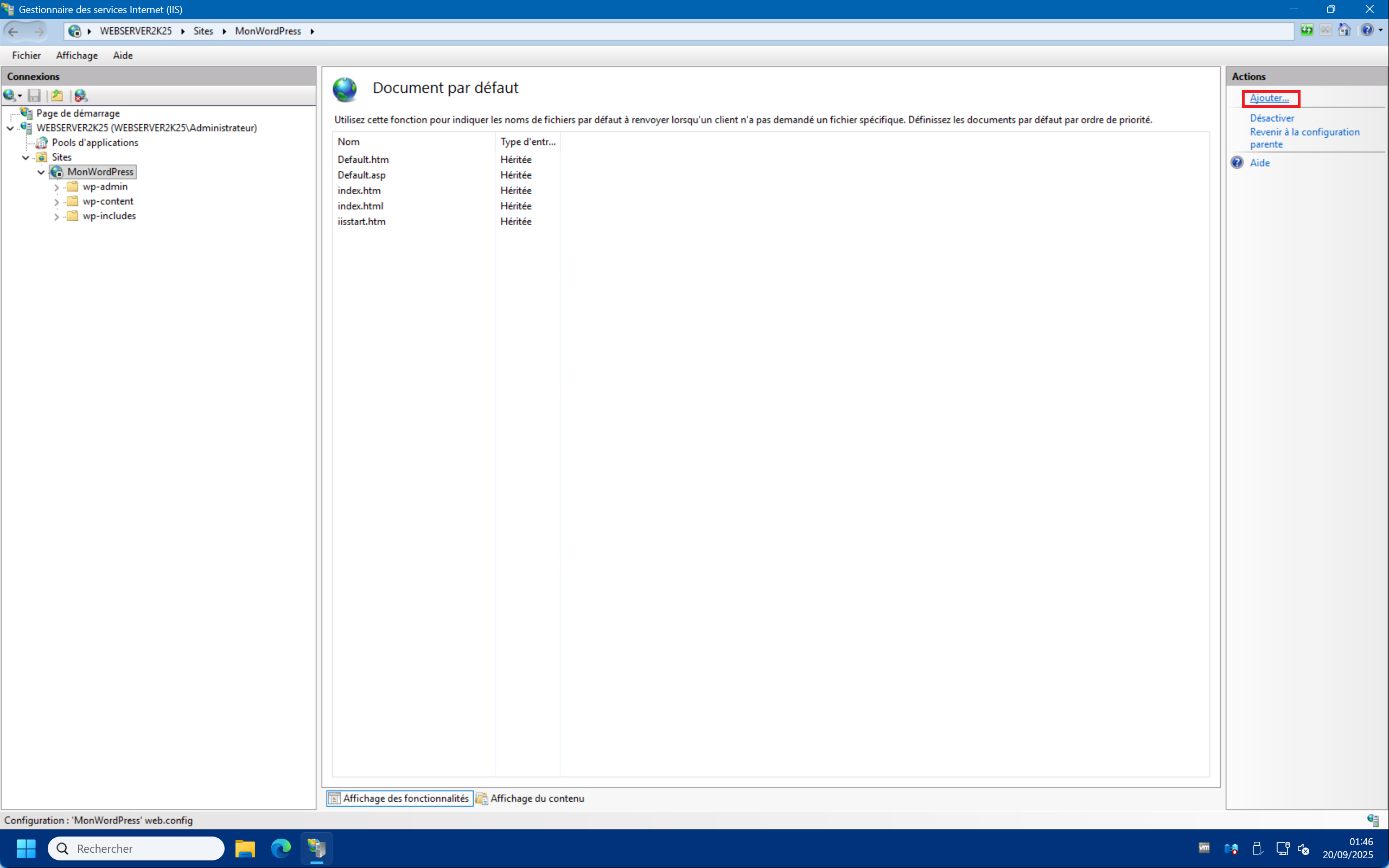 4 – Ça y est, votre site WordPress est créé! Vous devriez voir apparaître les répertoires « wp- » . Double cliquez sur « Document par défaut » , puis sur « Ajouter… » en haut à droite si le fichier « index.php » ne figure pas déjà dans la liste :