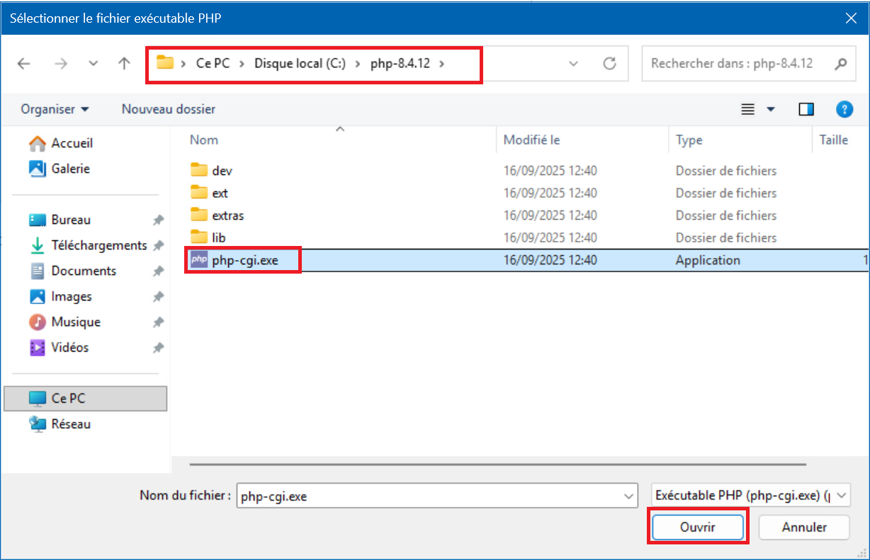 4 – Naviguez dans Ce PC > Disque local (C:) > php-8.4.12 , puis sélectionnez le fichier « php-cgi.exe » et cliquez sur « Ouvrir » :