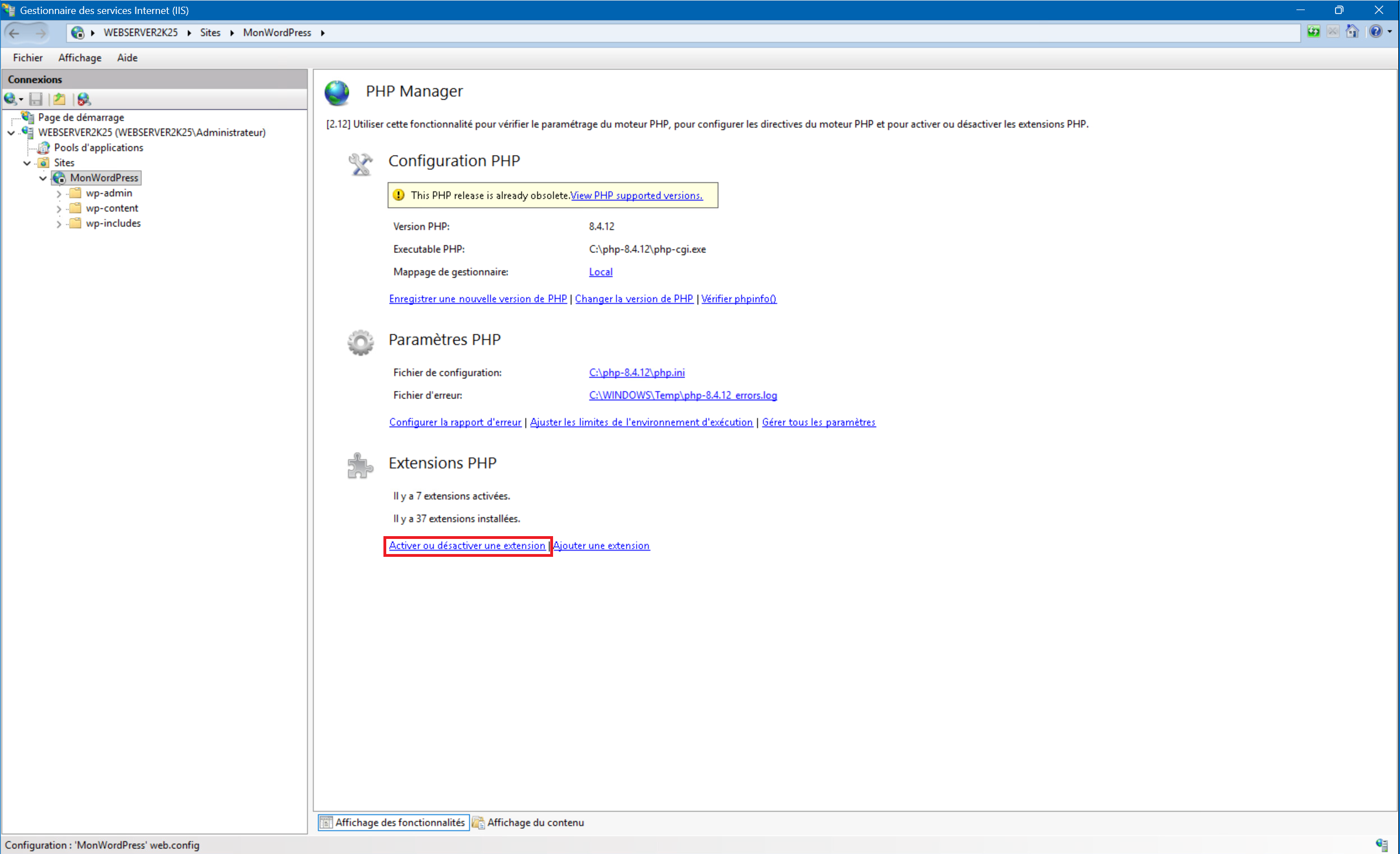 6 – Un fois revenu sur PHP Manager cliquez sur « Activer ou désactiver une extension » :