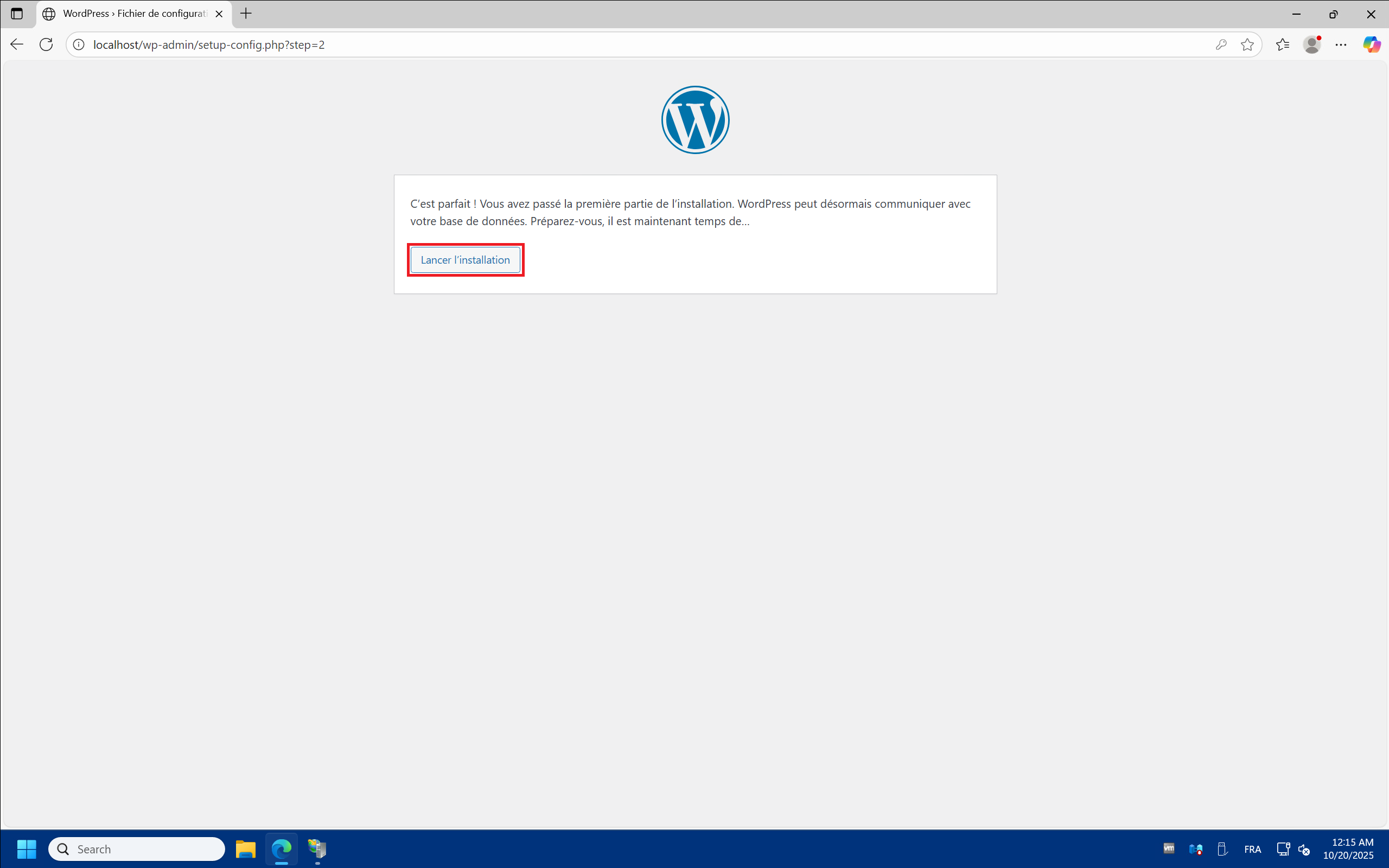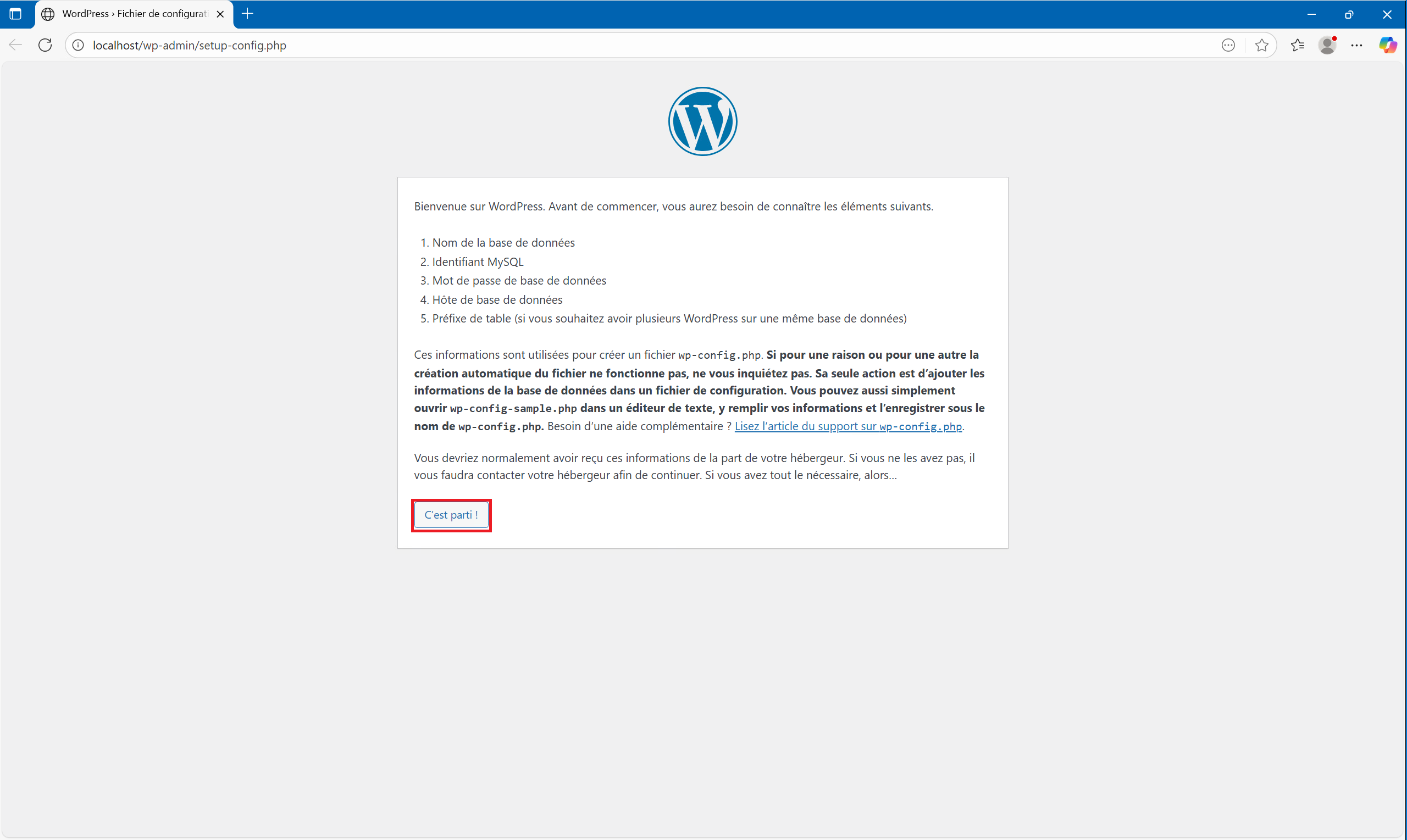 1 – Tapez « http://localhost » dans la barre d’adresses de votre navigateur Web. Au lancement de l’assistant d’installation de WordPress cliquez sur « C’est parti ! » , puis sur « Lancer l’installation » :