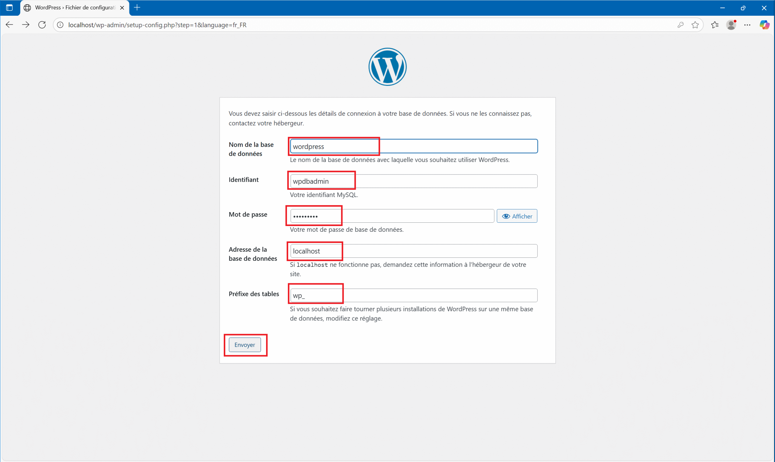 2 – Entrez les informations que vous avez définies à l’installation de la base de données MariaDB. Le nom de la base (dans notre exemple « wordpress » ), l’identifiant du compte administrateur de la base et son mot de passe, puis dans le champ « Adresse de la base de données » laissez « localhost » et de préférence laissez aussi laissez « wp- » comme préfixe (mais vous pouvez définir ce que vous voulez). Enfin validez en cliquant sur « Envoyer » :