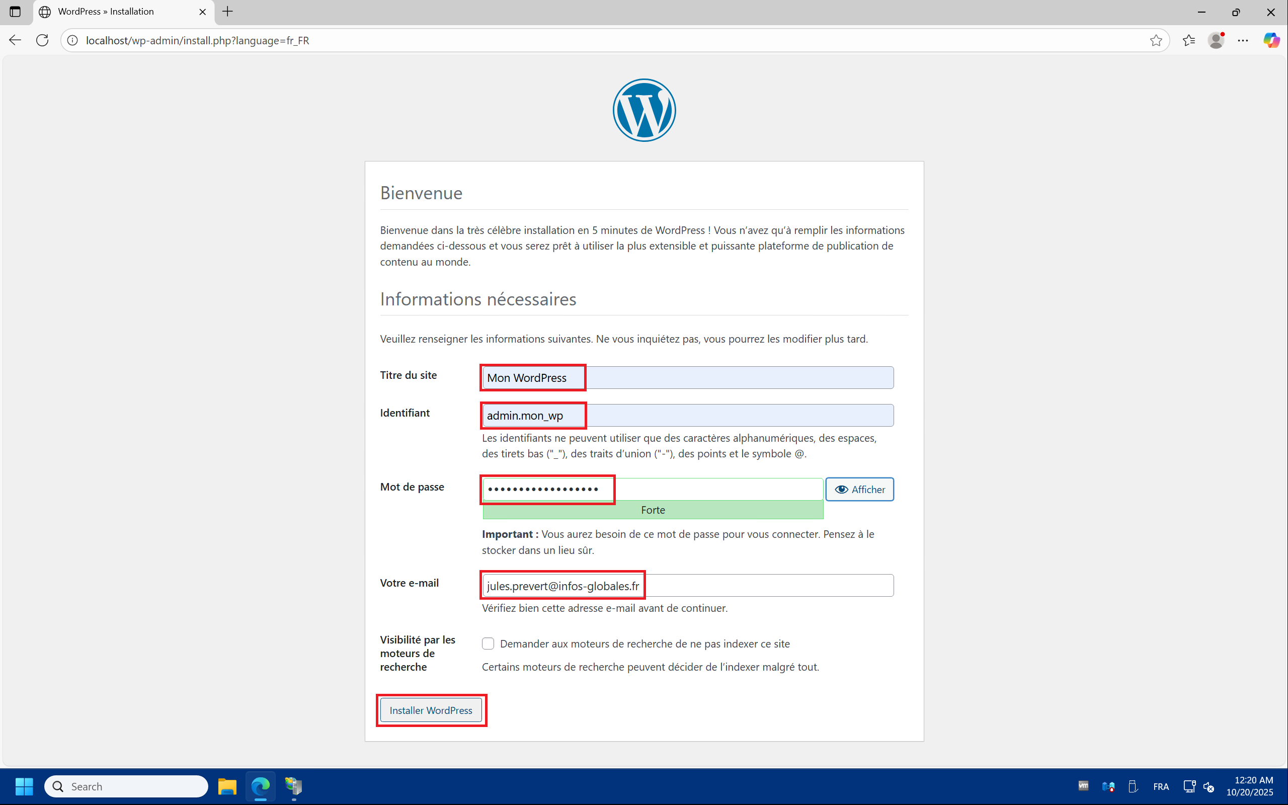 4 – Une fois WordPress connecté à la base vous pouvez configurer le site lui-même. Choisissez un titre pour votre site dans le champ « Titre du site » , puis définissez un nom d’utilisateur pour le compte d’administration de WordPress dans le champ « Identifiant » . Un mot de passe complexe vous sera suggéré mais vous pouvez en définir un de votre choix dans le champ « Mot de passe » . Ensuite renseignez une adresse mail valide dans le champs « Votre e-mail » . Et enfin cliquez sur « Installer WordPress » :