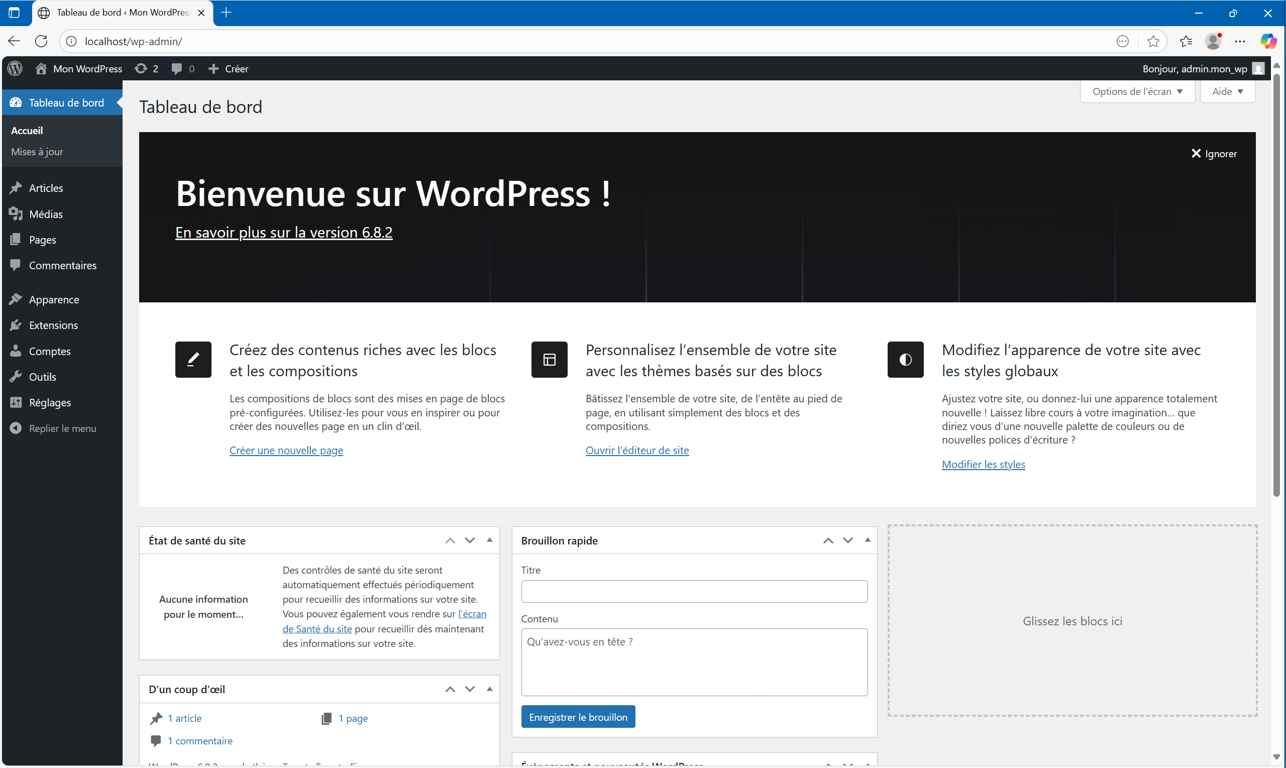 Ici vous avez un site WordPress avec la configuration minimale pour fonctionner en local. Dans le prochain article nous verrons comment installer certaines extensions PHP comme Imagick, activer le protocole https, augmenter la taille des téléversements et optimiser le serveur en terme de performances. Et un autre article sera consacré à la mise en ligne proprement dite, avec la configuration du réseau, du nom de domaine et la mise en place d’un certificat https.