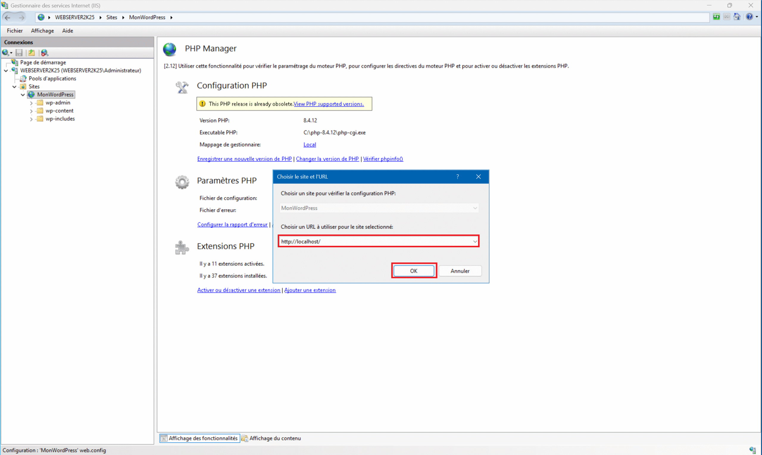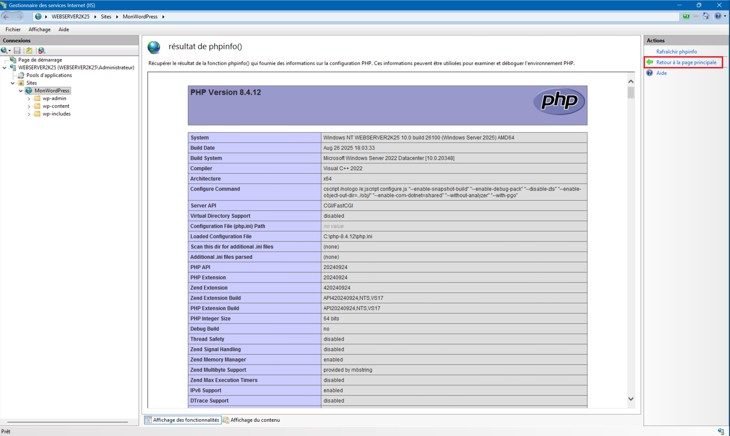 3 – Vous pouvez vérifier le bon fonctionnement de PHP en lançant « PHP Manager » , puis cliquez sur « Vérifier phpinfo() » et ensuite « OK » . La page de configuration de PHP devrait apparaître. Une fois visualisée vous pouvez cliquer sur « Retour à la page principale » :
