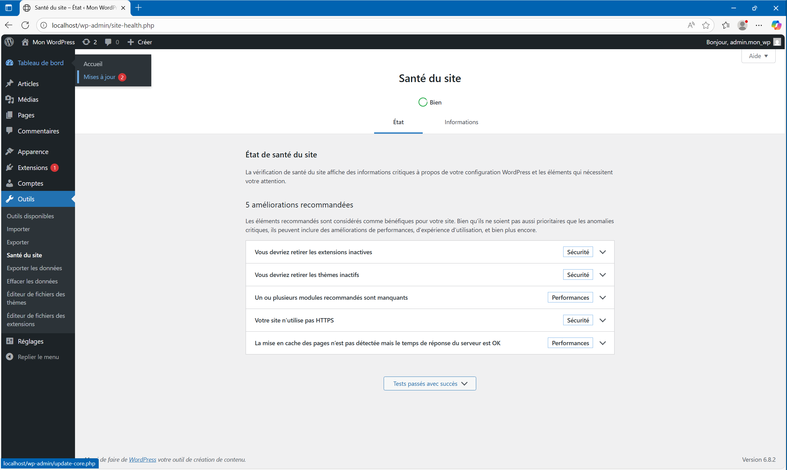 6 – Avant de commencer à éditer votre site vous pouvez jeter un œil à la santé du site en cliquant sur « Outils » puis « Santé du site » :