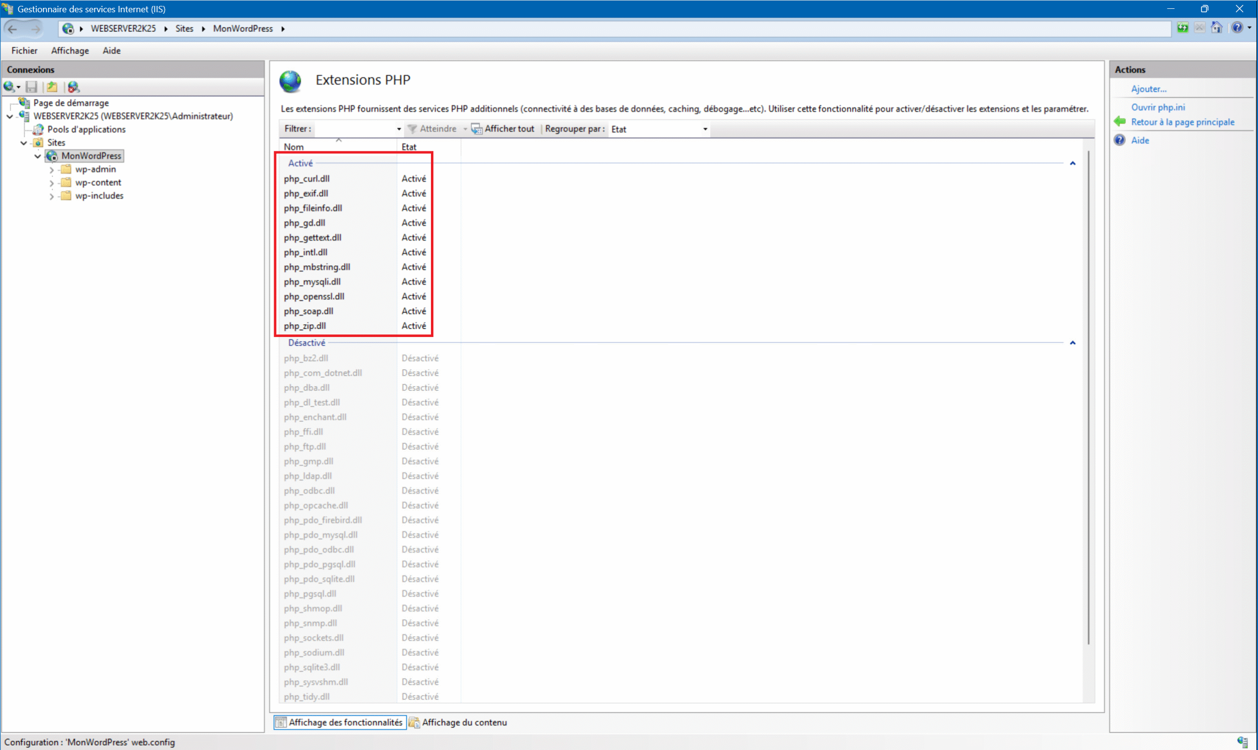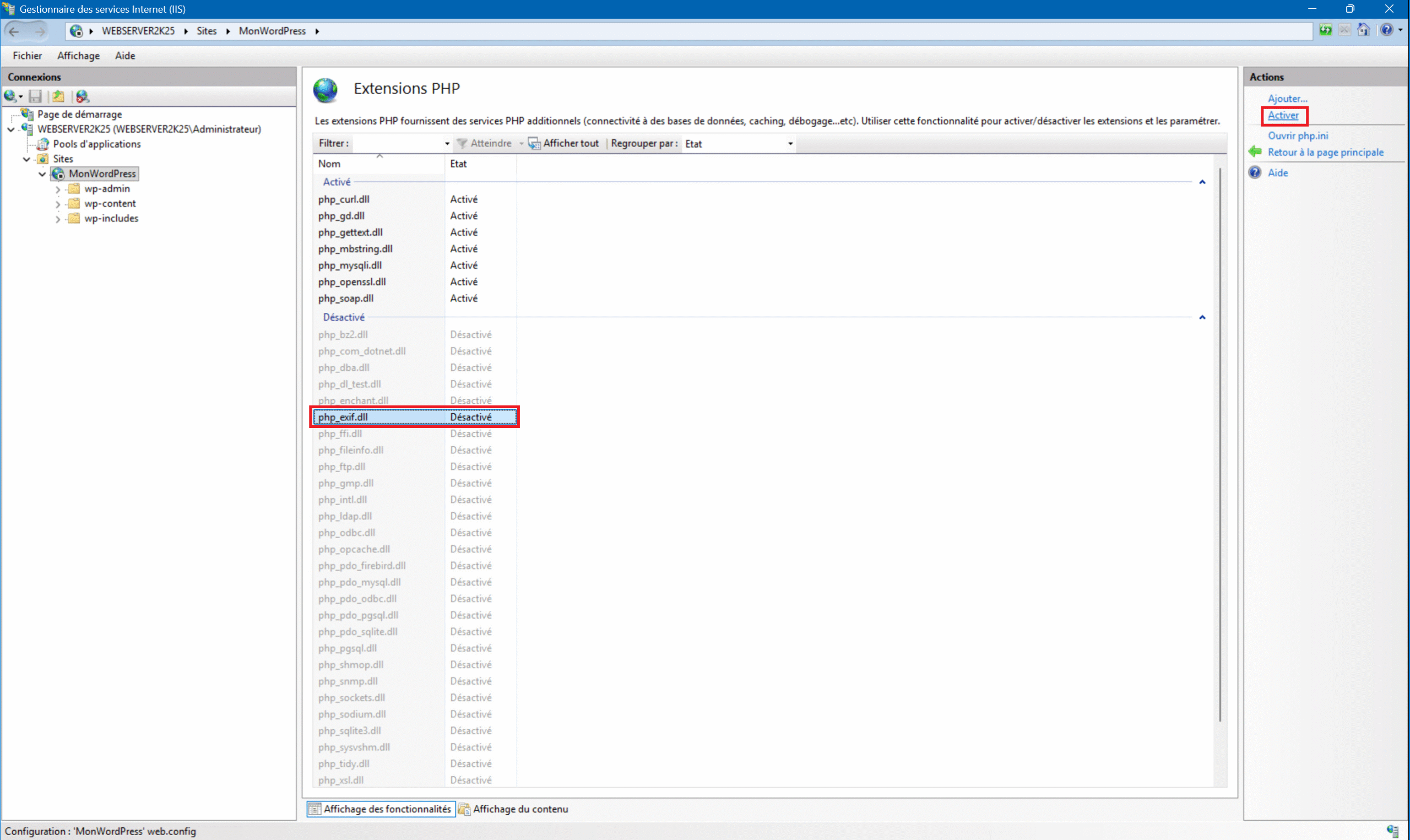 7 – Dans cette vue vous pouvez voir et gérer les extension PHP installées, activées ou désactivées. Pour activer une extension désactivée il suffit de cliquer dessus puis sur « Activer » en haut à droite. Voici la liste des extensions supplémentaires à activer pour que WordPress fonctionne :