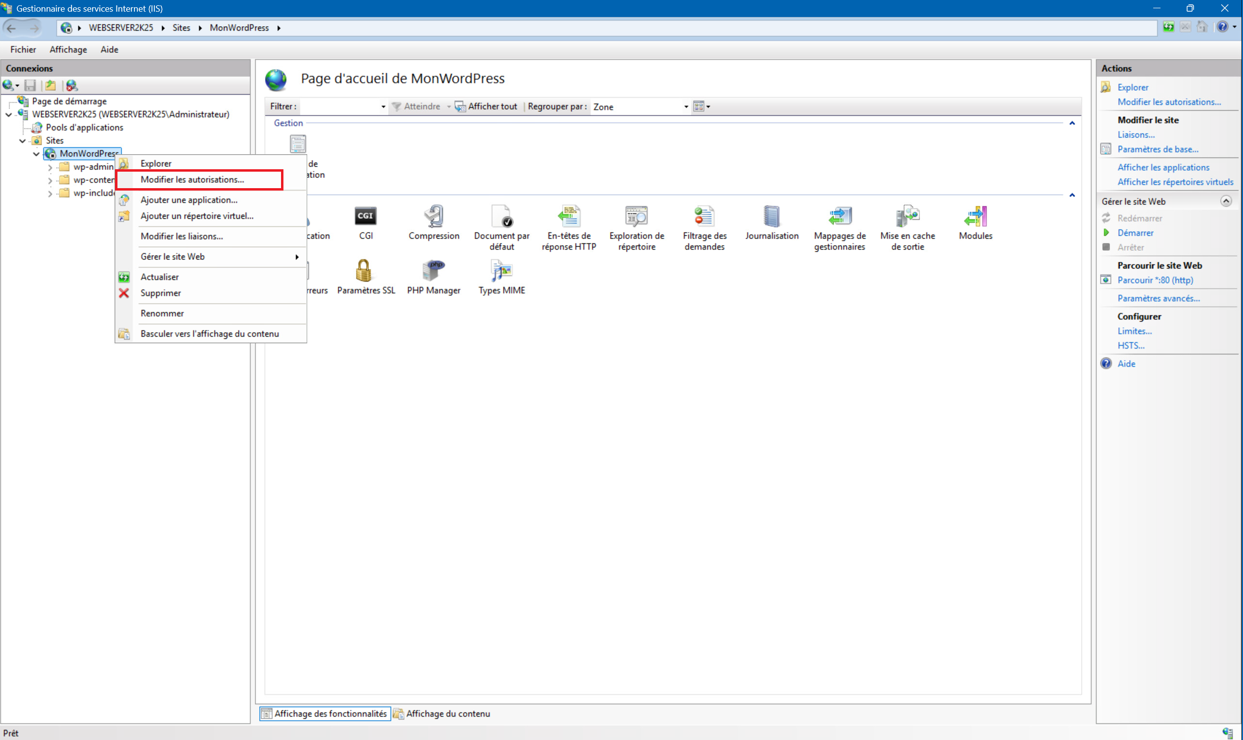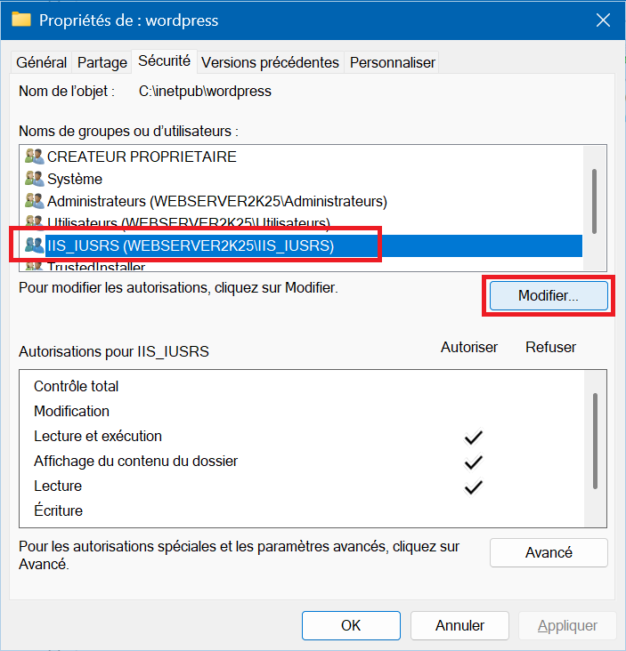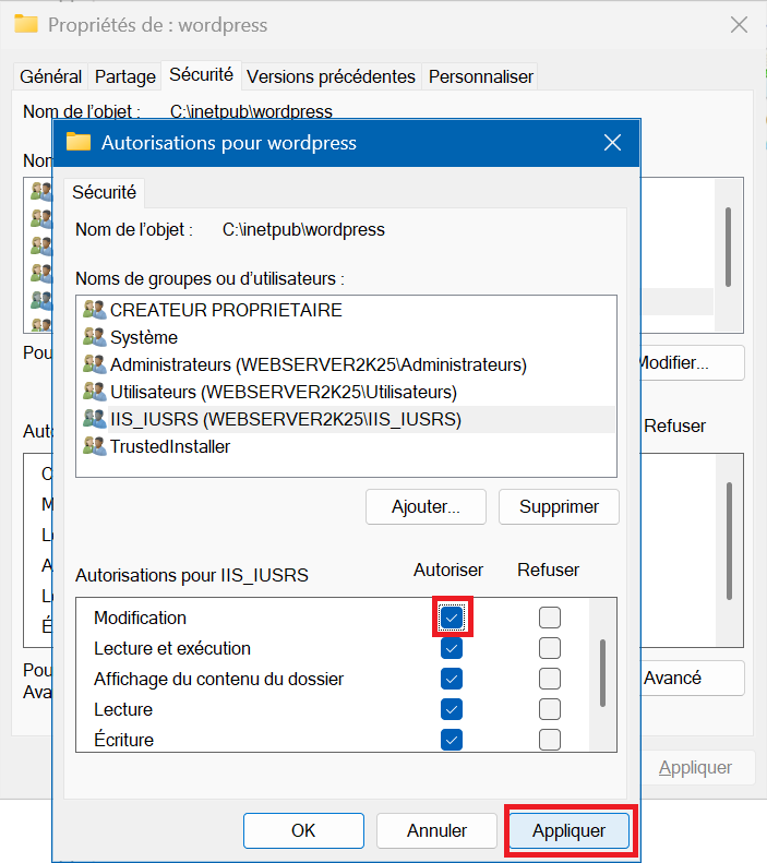 2 – Cliquez sur l’onglet « Sécurité » puis sélectionnez le groupe « IIS_IUSRS » et cliquez sur « Modifier… » . Ensuite dans la fenêtre « Autorisations pour wordpress » cochez « Modification » puis « Appliquer » et fermer les propriétés.