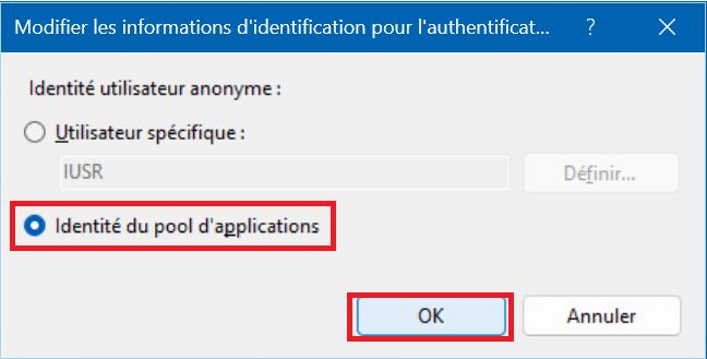 5 – Dans la fenêtre qui apparaît sélectionnez « Identité du pool d’applications » et cliquez sur « OK » . Voilà, vos permissions sont correctement configurées.
